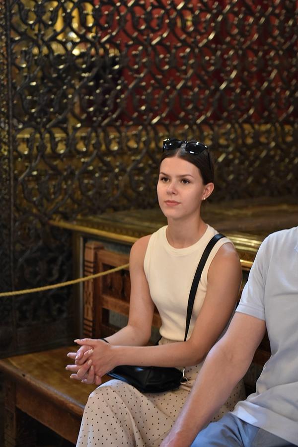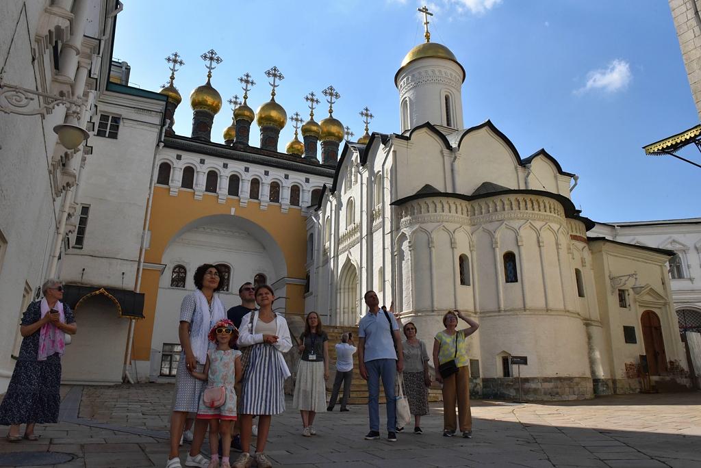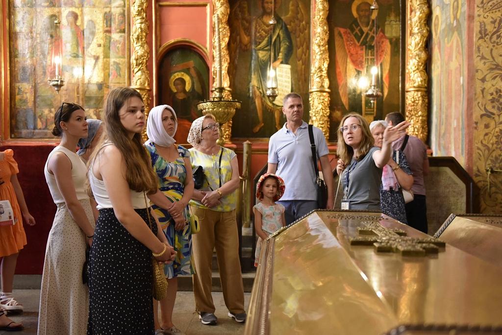 Началась прогулка в Александровском саду. Пройдя по его аллеям, паломники начали свой путь к Троицким воротам Кремля. Экскурсовод Екатерина Борисовна рассказала об истории Кремля, его территории, башнях и площадях, среди которых — самая древняя площадь на Руси - Соборная площадь. Гости экскурсии услышали рассказ об итальянском архитекторе Антонио Солари, который в XV веке руководил строительством Кремля, и узнали интересные факты о Царь-Колоколе и Царь-Пушке. Паломники увидели дворцы русских государей, императоров, иерархов Русской Православной Церкви, а также резиденцию Президента России.
