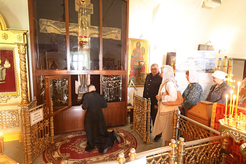 В начале паломники отправились храм во имя святителя Иоанна Златоуста в селе Годеново подворья Никольского женского монастыря. Удивительным образом совпало, что дата поездки пришлась на канун праздника ИзнесениеЧестныых Древ Животворящего Креста Господня, и паломники смогли поклониться и помолиться перед удивительной святыней Русской земли Годеновским крестом.
