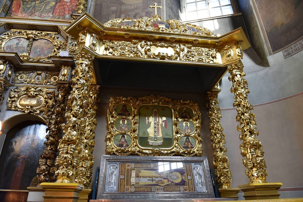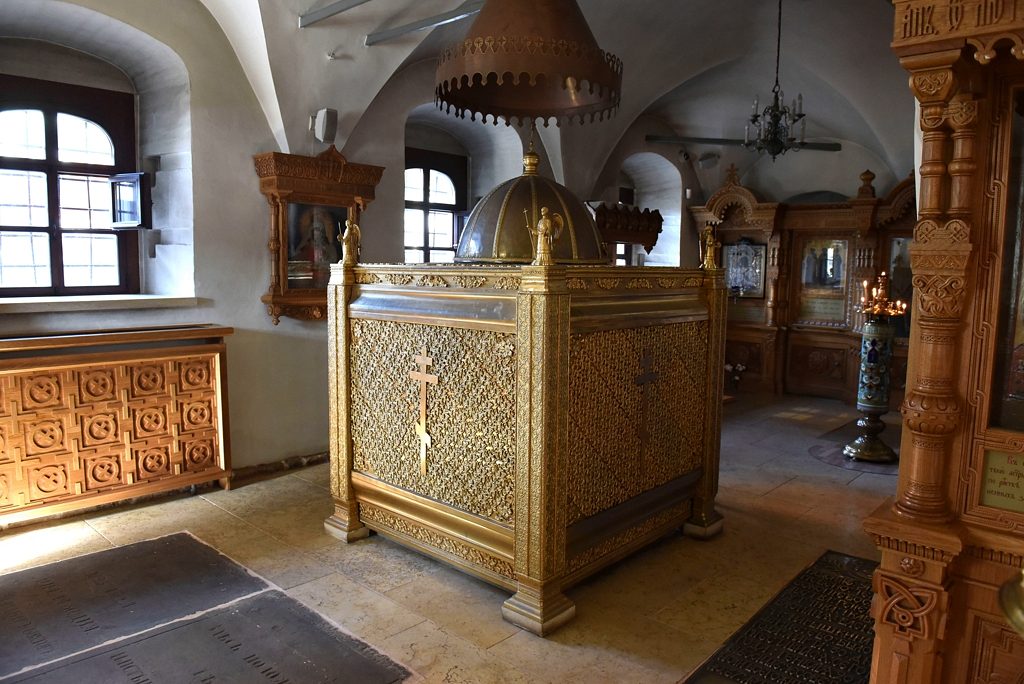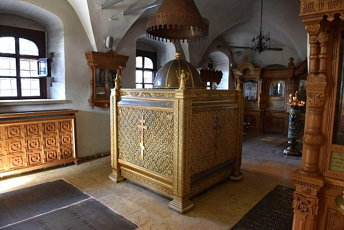 Другой духовной жемчужиной Большого собора являются святые мощи святителя Тихона, Патриарха Всероссийского, почивающие в золоченой раке.