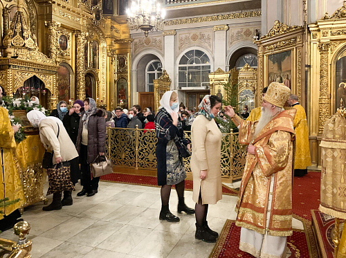 Его Преосвященству сослужили клирики собора.