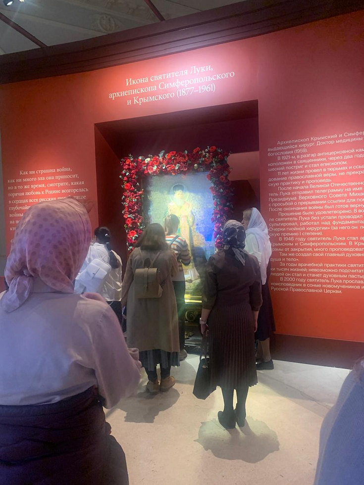 А поскольку одним из главных организаторов и вдохновителем этой масштабной выставки в центре Москвы выступил Патриарший совет по культуре Русской Православной Церкви, то достаточная часть экспозиции и материалов в рассказах экскурсовода была отведена роли Православной Церкви и русского священства, неискореняемой вере в милость и помощь Божию, которая укрепляла людей в эти годы. Большим подарком для посетителей выставки-форума стала возможность приложиться к ковчегу с мощами святителя Луки Крымского и его иконе, привезенных в столицу из Свято-Троицкого женского монастыря города Симферополя.
