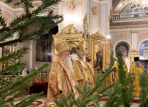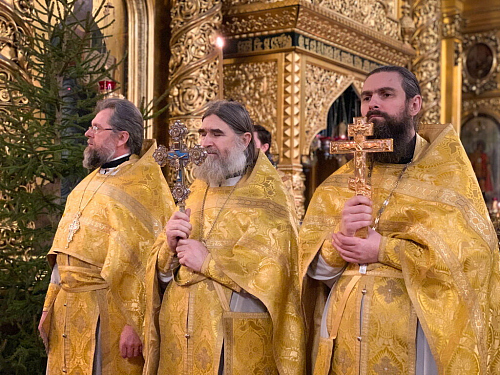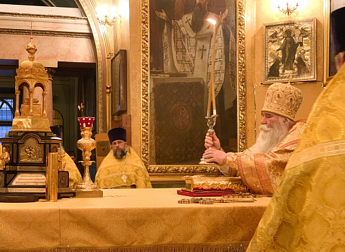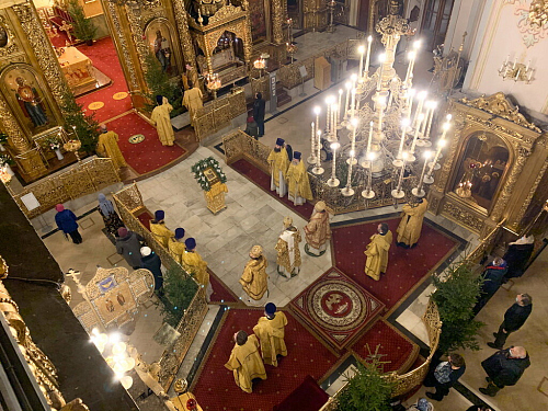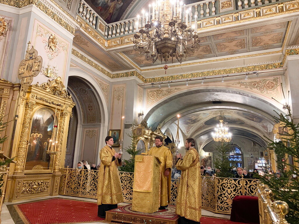 Его Высокопреосвященству сослужили епископ Дмитровский Феофилакт, викарий Патриарха Московского и всея Руси по г. Москве, епископ Павлово-Посадский Фома, руководитель Административного секретариата Московской̆ Патриархии и столичное духовенство.