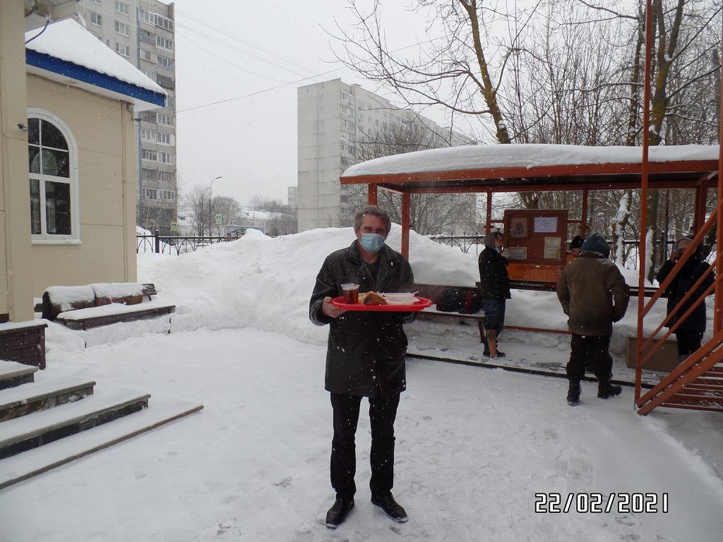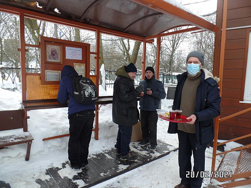 Также по благословению настоятеля, оказывается помощь бездомным людям, нуждающимся в горячей еде. Волонтеры храма ежедневно раздают горячие обеды для бездомных. В день удается накормить 10-15 человек. Еда раздается за территорией храма в одноразовой посуде с соблюдением всех санитарных норм и дезинфекции.