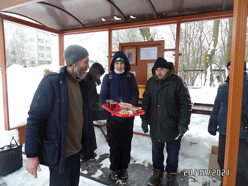 При этом с бездомными волонтеры проводят беседы о Православной вере, пред трапезой совершают молитвы.