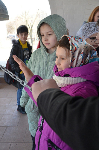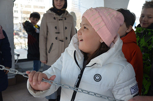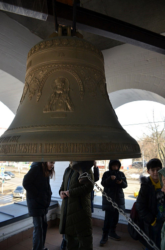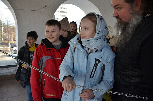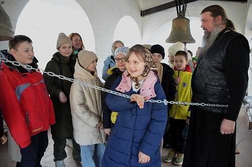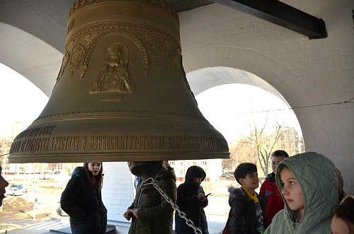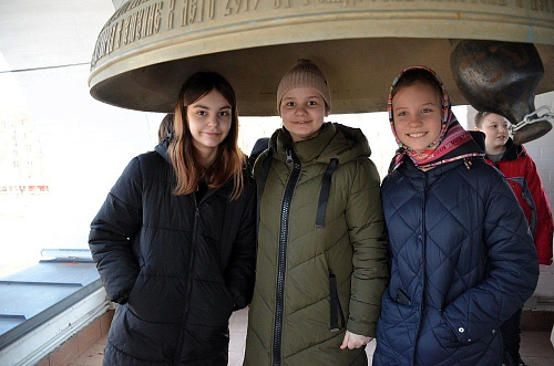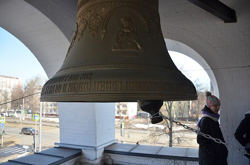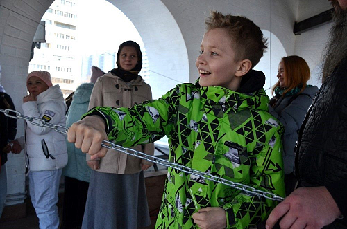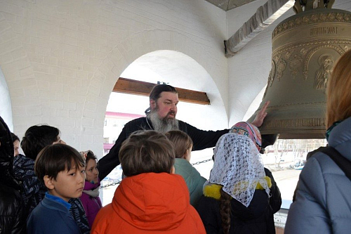 Большое впечатление произвела на детей колокольня, где иерей Иоанн рассказал о колоколах.Во время поста колокольный звон не исполняется, но дети могли самостоятельно ударить по очереди в самый большой колокол, который весит 1,5 тонны и услышать его неповторимое звучание.