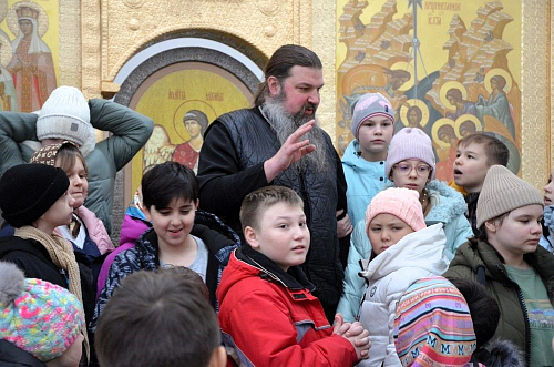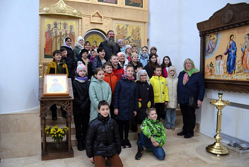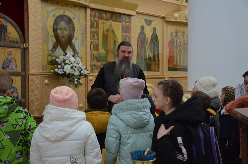 Ребята познакомились с настоятелем храма иереем Иоанном Омелянчуком, который рассказал о храмовых иконах, показал купель для совершения Таинства Крещения в крестильном приделе в честь преподобного Сергия Радонежского, а также продемонстрировал игуменский посох. Дети с большим интересом слушали рассказ о преподобном Сергии, отвечали на вопросы настоятеля.