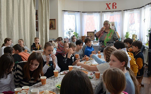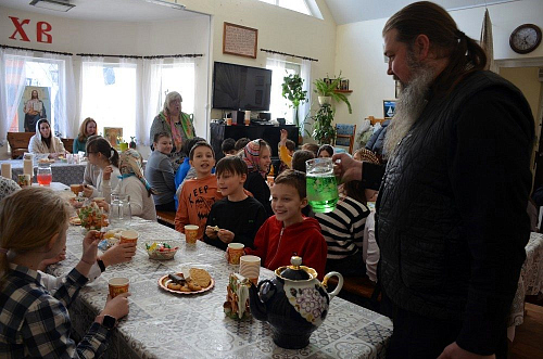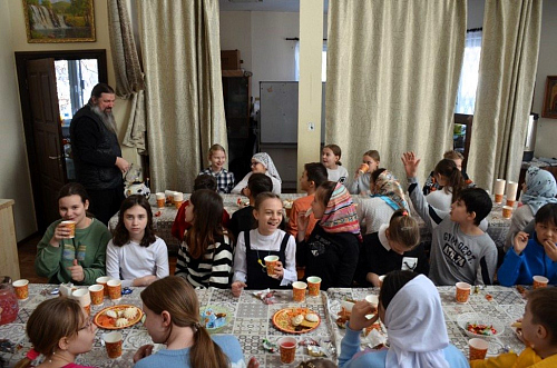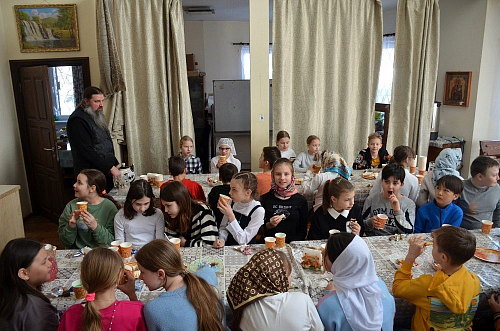 По окончании экскурсии настоятель пригласил всех гостей в Воскресную школу на сладкий стол, где продолжилась беседа. Дети с радостью делились своими впечатлениями от экскурсии, а также задавали вопросы иерею Иоанну. Многих интересовала тема спасения души, что происходит после смерти и каким образом человек переходит в вечность.