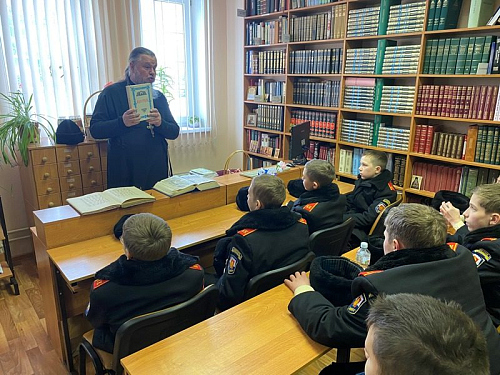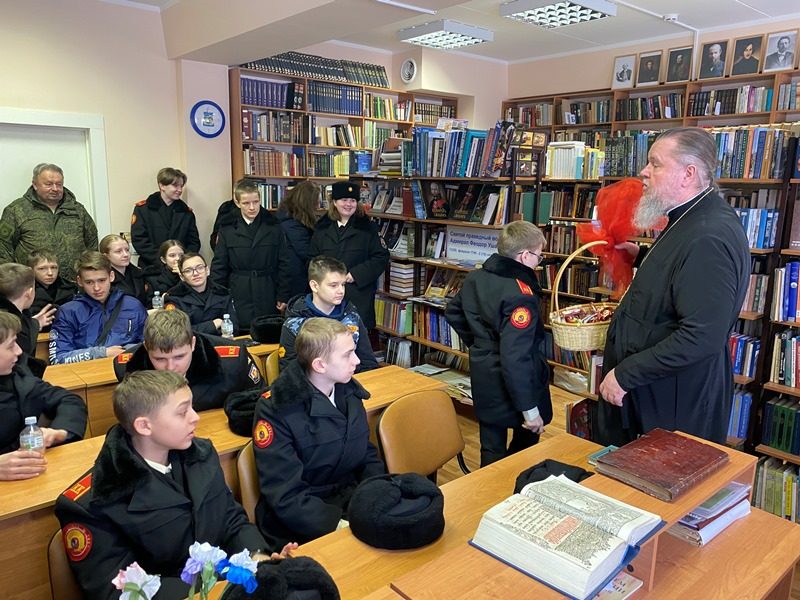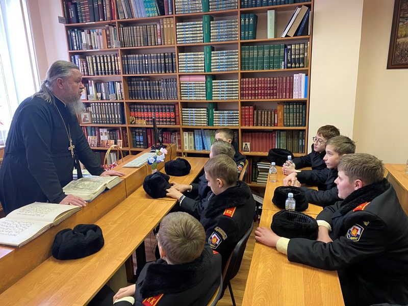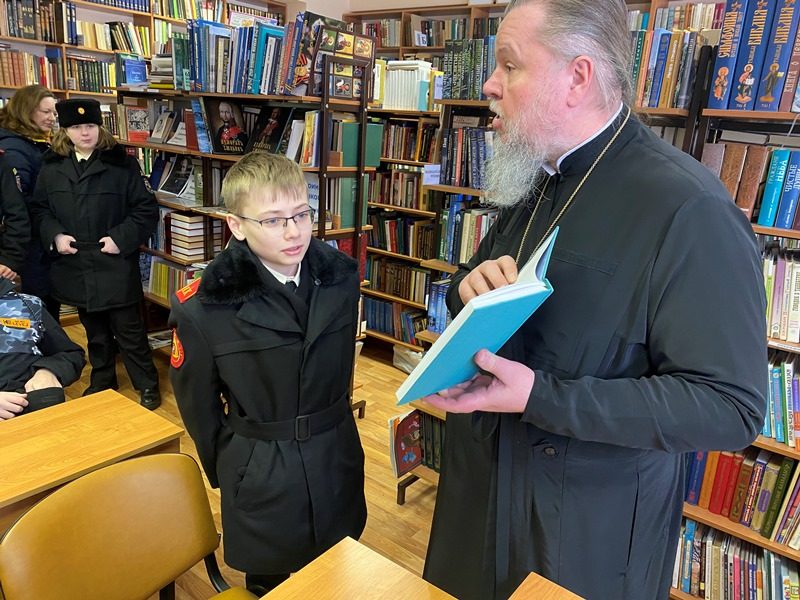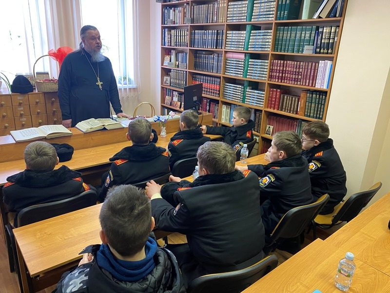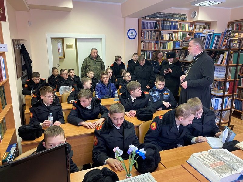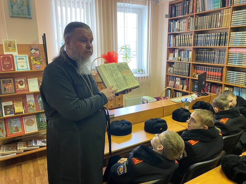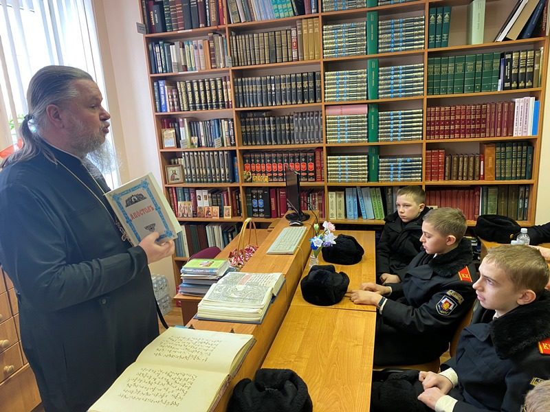 15 марта 2024 года в библиотеке дома причта храма святого праведного воина Феодора Ушакова в Южном Бутове настоятель игумен Дамиан (Залетов) провел специальное занятие о книгопечатании и книге для кадетов-юнармейцев.