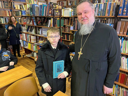 Игумен Дамиан напомнил ребятам о празднике Дне православной книги, рассказал об истории книгопечатания в России. Настоятель показал учащимся школы старинное Евангелие и книгу с древнерусскими нотами, крюками.