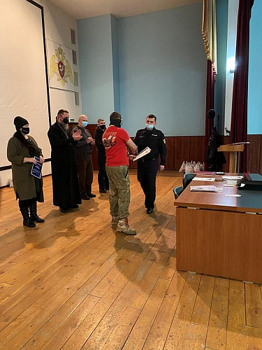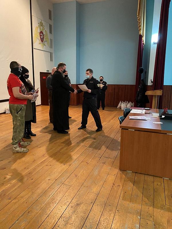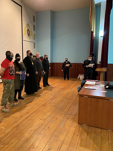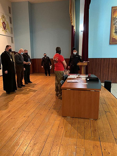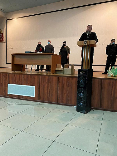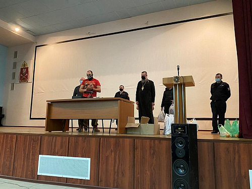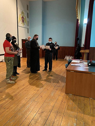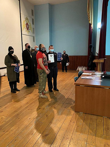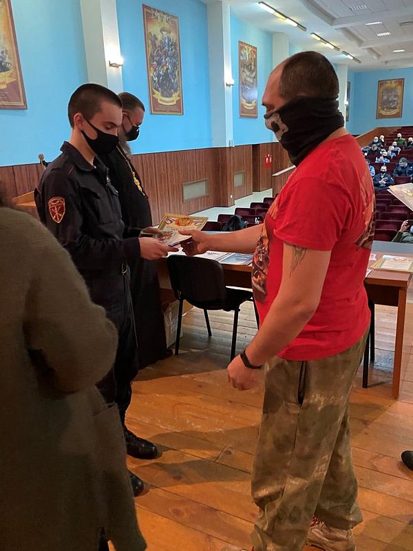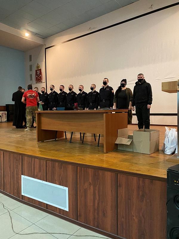 Настоятель храма святого праведного воина Феодора Ушакова в Южном Бутове игумен Дамиан (Залетов) выступил перед воинами и поздравил их с праздниками Рождества Христова и Нового года. Особое внимание настоятель обратил на личность непобедимого адмирала Ф.Ф, Ушакова, который прославился человеколюбием и мужеством. Игумен Дамиан напомнил, что первая военная награда Святого адмирала была ему вручена за мужество и мудрость в защите своих воинов во время эпидемии.