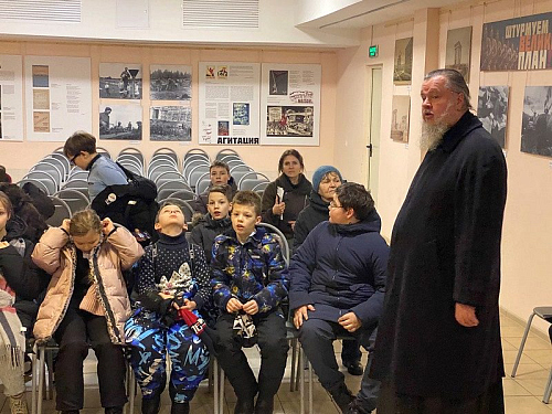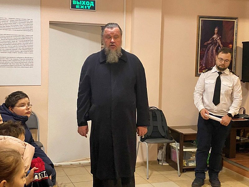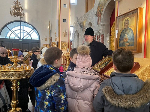 Внутри храма игумен Дамиан рассказал школьникам о тех событиях жизни Небесного покровителя храма - святого адмирала Феодора Ушакова и других Святых, которые стали примерами добродетели, преданности, смелости и скромности.