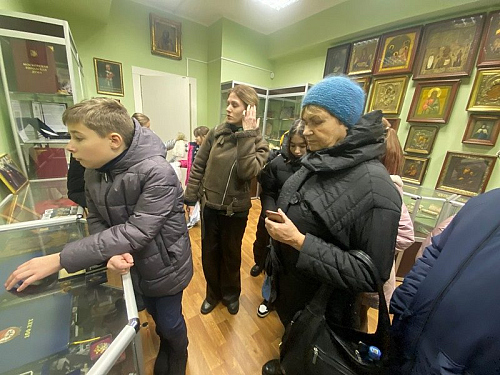 Гости посетили церковно-археологический музей храма. Игумен Дамиан показал им особый экспонат. Этот уникальный экспонат передали в новый музей представители Московского отделения Российского военно-исторического общества и поисковиков Военно-патриотического объединения «Нарский рубеж».