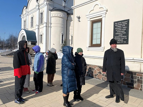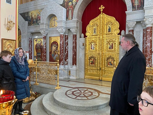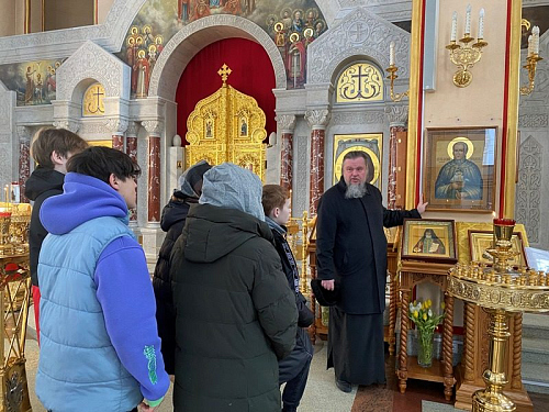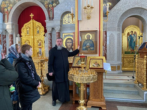 Внутри храма игумен Дамиан рассказал школьникам о тех событиях жизни Небесного покровителя храма - святого адмирала Феодора Ушакова и других Святых, которые стали примерами добродетели, преданности, смелости и скромности.