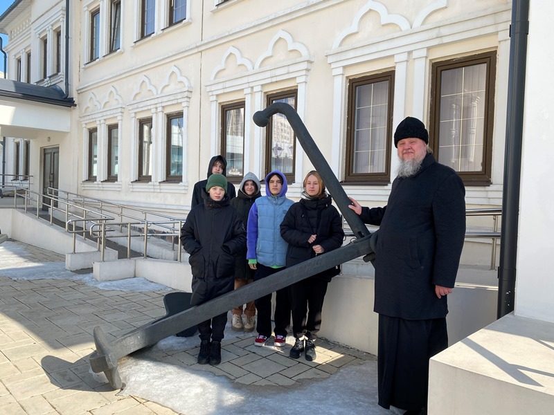 Настоятель рассказал посетителям о строительстве нового храма, его архитектуре и устройстве, доме причта и Воскресной школе, Навигацком классе, показал им аудитории и трапезную, Морской музей Подворья и Навигацкий класс.