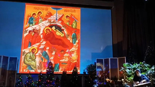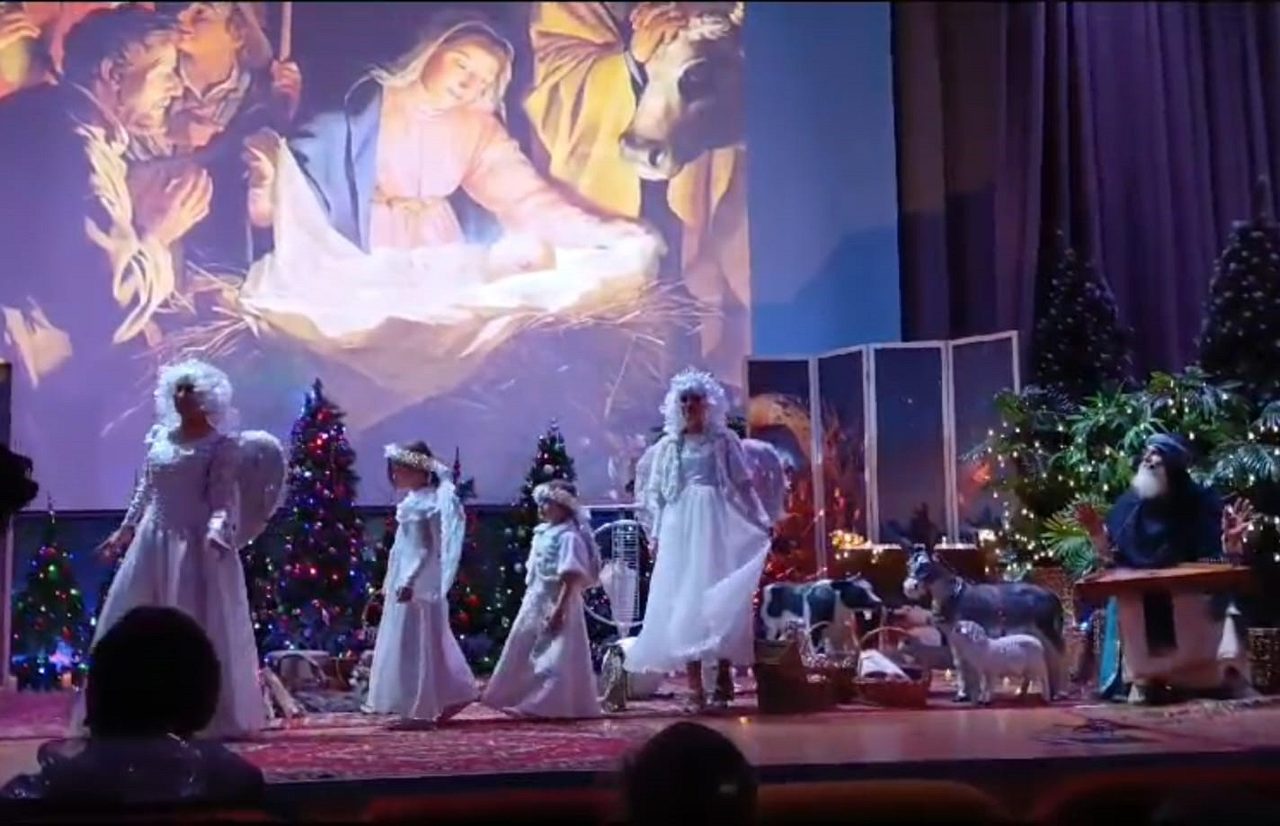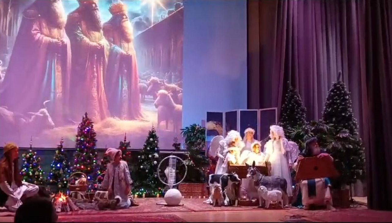 И действительно, когда открылся занавес, зрители увидели настоящее чудо: на сцене стоял сверкающий Рождественский вертеп, украшенные Рождественские елки и пальмы, а издали раздавалась таинственная восточная музыка. Из зрительного зала выходил седовласый Иосиф. В руках у него был старинный музыкальный инструмент киннор (гусли), а на большом экране зрители увидели вертеп, где в яслях лежит только что рожденный Младенец Иисус.