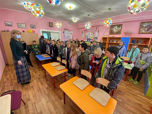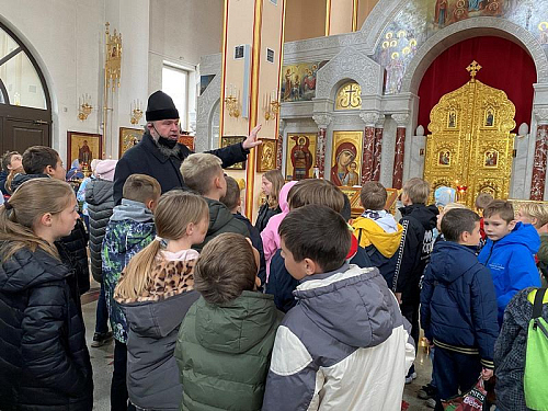 Школьников сопровождали преподаватели и родители, которые сами с интересом слушали рассказ священнослужителя и участвовали в беседе.