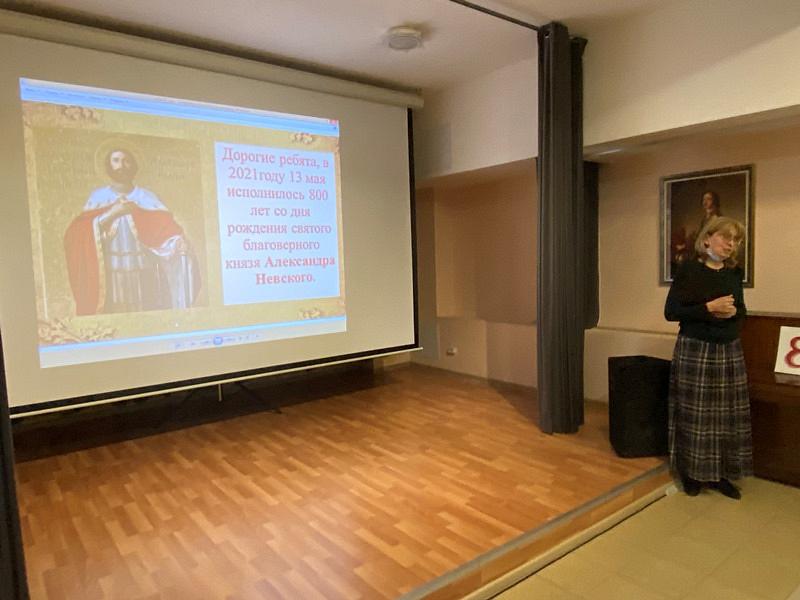 Далее ребята проследовали в дом причта, где посетили Воскресную школу, Навигацкий класс, библиотеку и кружки. В актовом зале Воскресной школы ребятам была предложена лекция о святом князе Александре Невском, 800-летие которого широко отмечается в России. Урок провела директор Воскресной школы Кормилицына Лариса Игнатьевна. Ребята могли увидеть много интересного фото и видео материала, которым сопровождался урок.