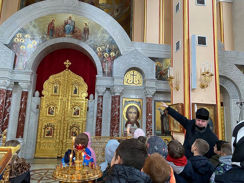 Внутри храма игумен Дамиан рассказал школьникам о тех событиях жизни Небесного покровителя храма - святого адмирала Феодора Ушакова. А также рассказал о преподобном Феодоре Санаксарском (Ушакове), святом князе Александре Невском, святом князе Димитрие Донском и о других святых, которые стали примерами добродетели, преданности, смелости и скромности. Многое из этого ребята уже изучали на уроках Основ Православной культуры.