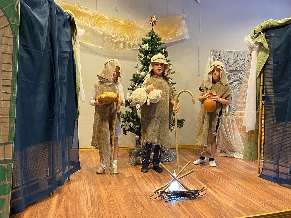Учащиеся подготовили спектакль "Рождественское путешествие", сценарий которого традиционно пишется для детей певчей храма и ответственной за молодёжное служение Марией Шуваловой. Сказочные истории каждый год разные, и они настолько интересные, что дети просят родителей читать их перед сном. В этот раз герои спектакля преодолевали препятствия, путешествуя сквозь времена года с волшебной шкатулкой. В спектакле дети исполняли роли пастухов и волхвов.