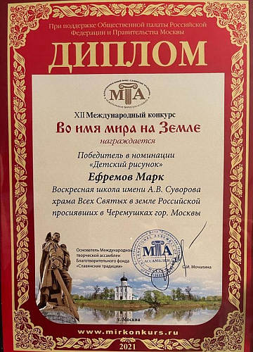 04 ноября 2021 года, в День народного единства, учащиеся Воскресной школы храма Всех Святых, в земле Российской просиявших, в Черемушках имени А.В. Суворова, по благословению настоятеля храма протоиерея Виктора Алипичева, приняли участие в конкурсе детского рисунка «Во имя мира на Земле».