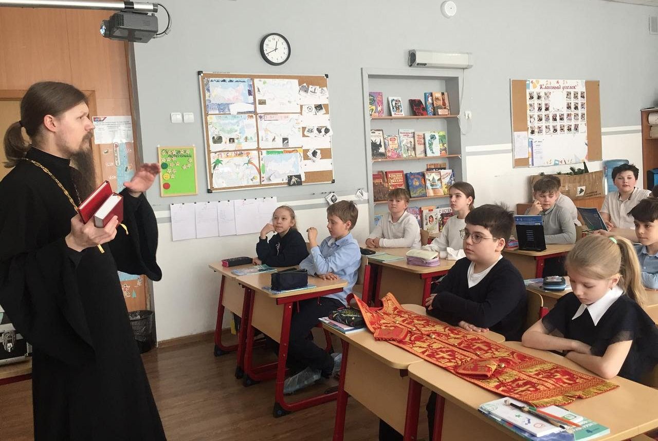 23 апреля 2024 года клирик храма святых равноапостольных князя Владимира и княгини Ольги священник Димитрий Гончаренко провел урок по курсу Основы Православной Культуры для четвертого класса школы № 2086 на тему: «Великий пост и предстоящий праздник Пасхи Христовой»