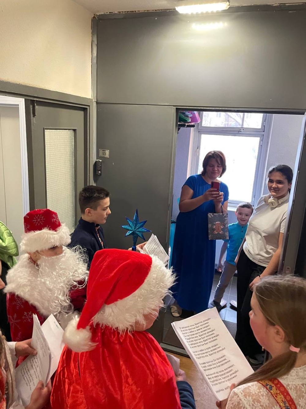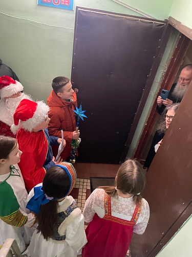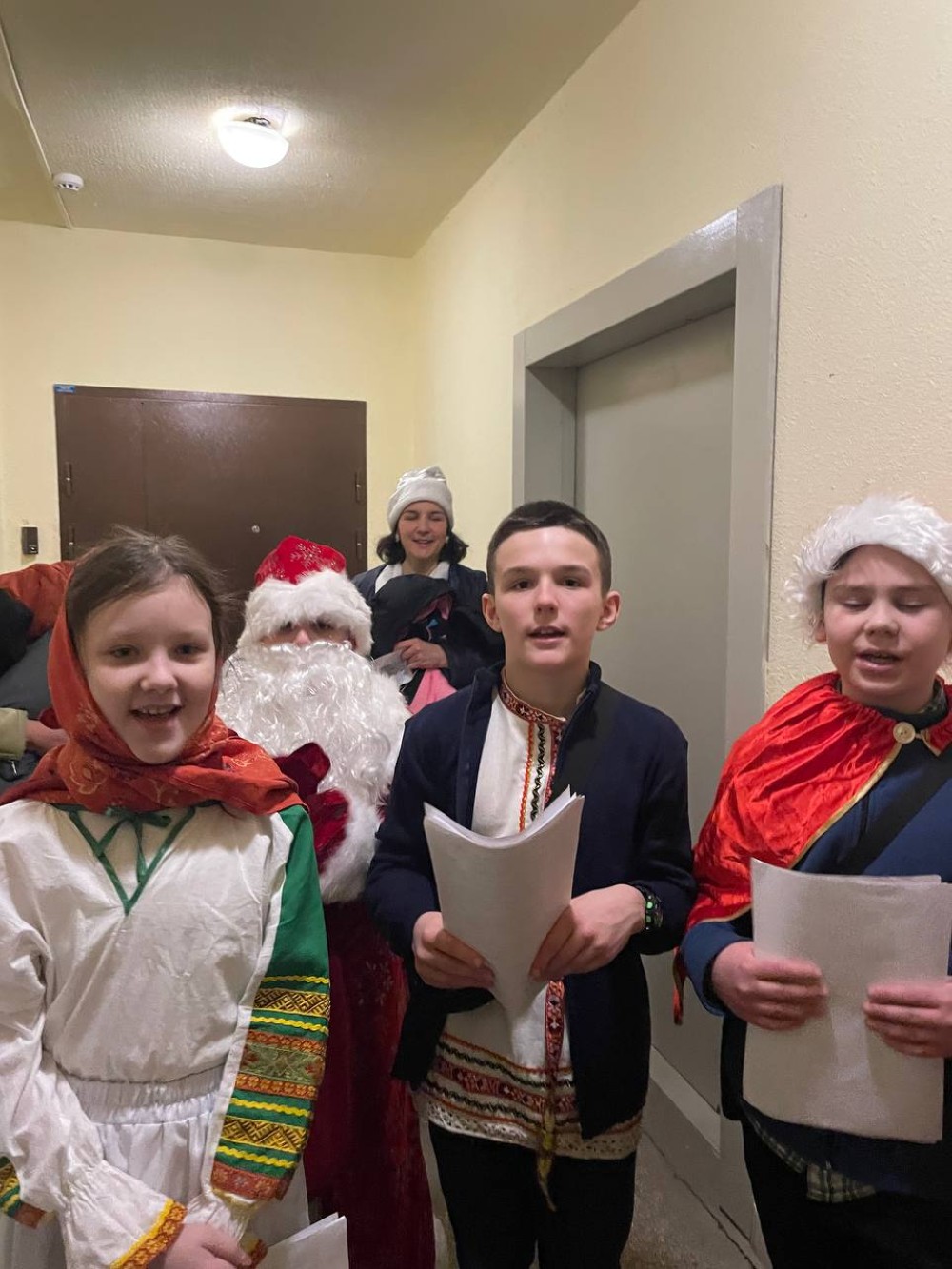 Юные Христославы - учащиеся Воскресной школы «Исток» с родителями отправились в соседние дома поздравлять прихожан храма и всех людей с Праздником.