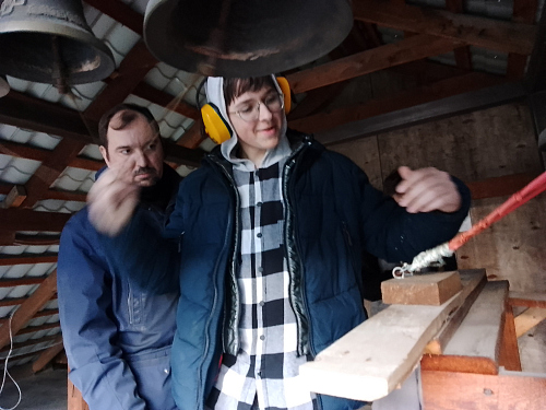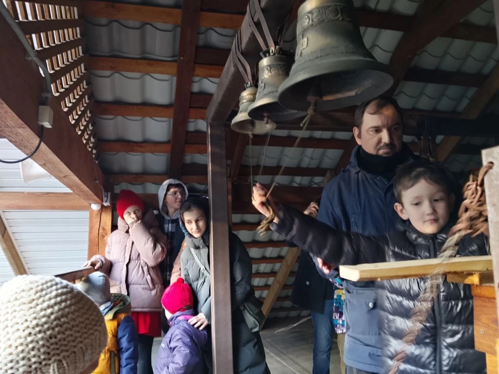 Затем ведущий показал технику колокольного звона и несколько основных видов перезвона. Каждый из участников попробовал ударить в колокола и с помощью ведущего исполнить пасхальный перезвон.