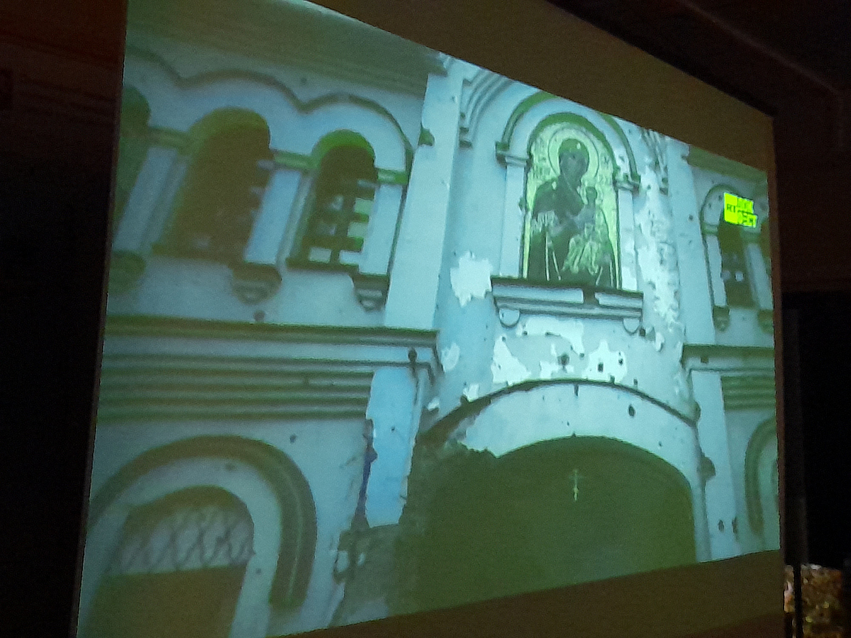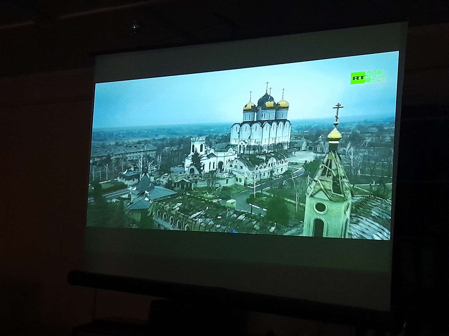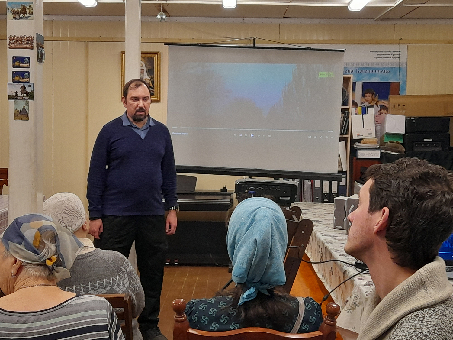 Перед показом ведущий кинолектория, катехизатор храма, Михаил Погорелов вкратце рассказал о Свято-Успенском Николо-Васильевском монастыре села Никольское Донецкой Народной Республики, который находится в центре военных действий, ведущихся в зоне СВО.