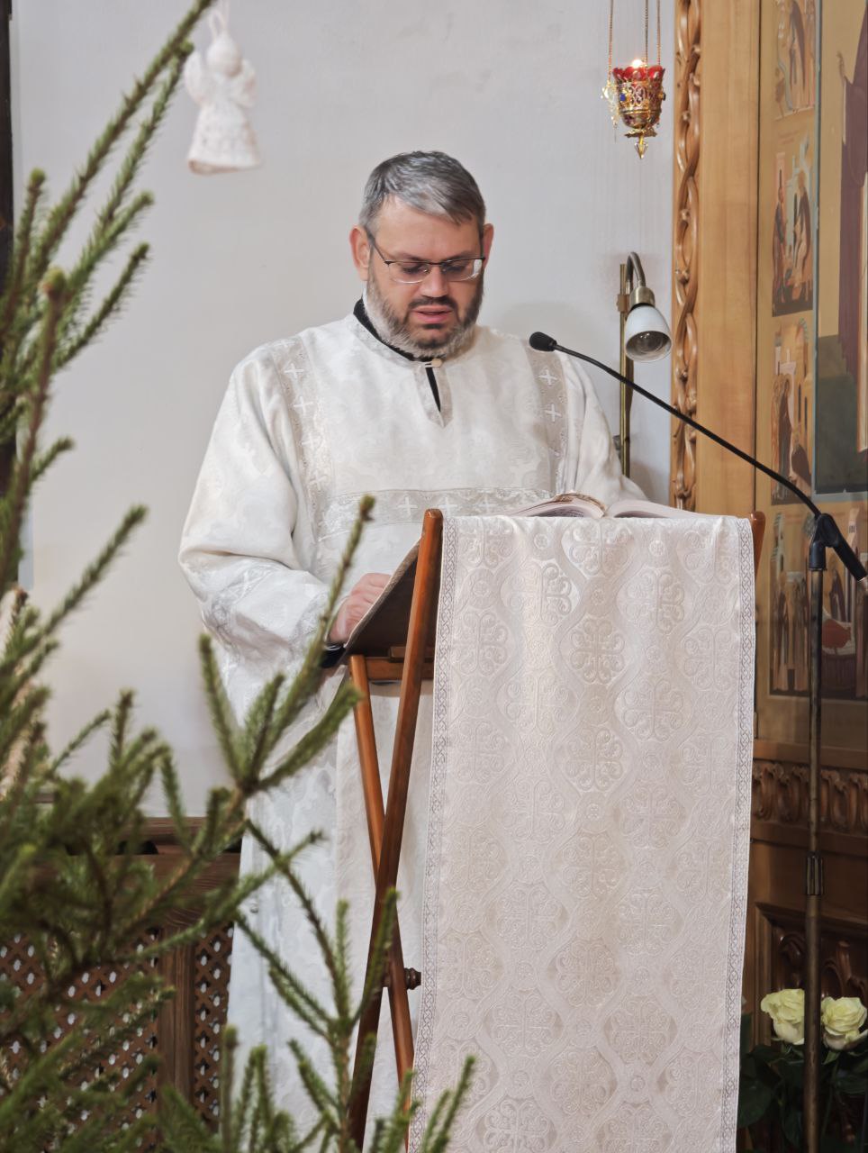 Всех гостей и прихожан встречал вертеп с Рождественской иконой, разместившийся перед крыльцом, в самом же центре храма по традиции — икона со сценой рождения Спасителя.