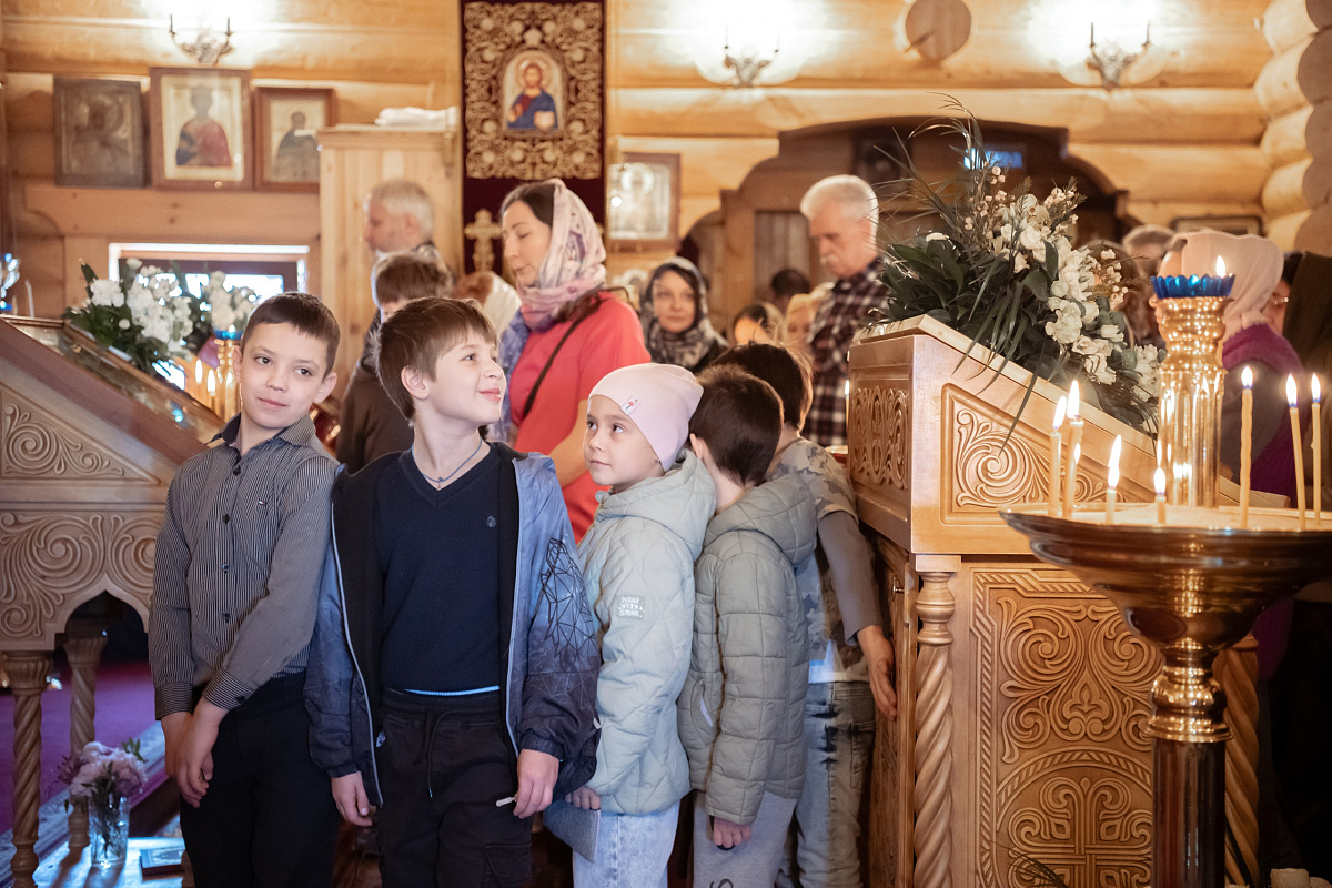 В свою очередь Владыка Алексий тепло поздравил духовенство и прихожан с праздником и обратился к собравшимся с архипастырским словом. Сегодня вспоминается событие, произошедшее накануне Входа Господня в Иерусалим. Воскрешая Лазаря, Спаситель показывает, для чего Он пришёл в мир: чтобы дать надежду и жизнь вечную. Праведный Лазарь был благочестив, исполнял заповеди Христовы, то есть жил так, как призывает жить Господь. Взирая на путь Лазаря, его сестёр Марфы и Марии, святых апостолов, задумаемся о том, как следует жить нам. Воскрешение Лазаря предшествует страданиям, смерти на Кресте и последующему Воскресению Господа нашего Иисуса Христа. Помня, какой ценой искупил Спаситель каждого из нас, принесём плоды покаяния и станем наследниками вечной жизни. В заключение архипастырь выразил надежду, что рядом с деревянным храмом со временем появится каменный, который распахнёт свои двери для всех ищущих правды Божией. Владыка искренне поблагодарил за труды настоятеля и его многочисленных помощников.