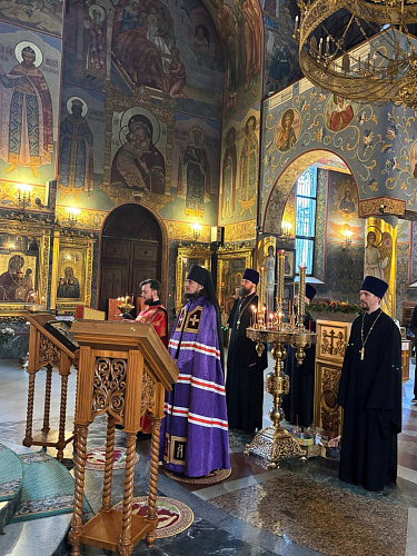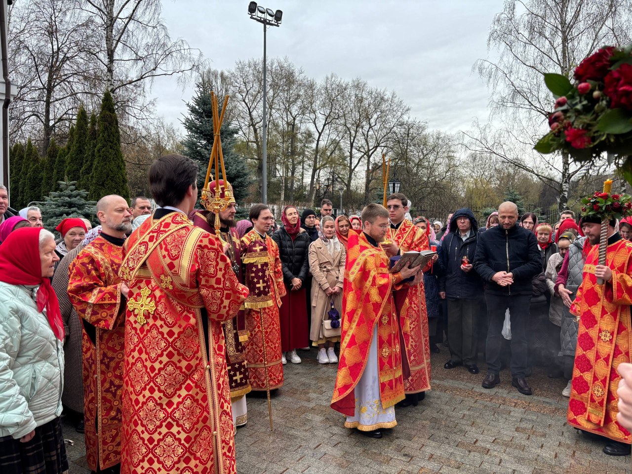 Богослужебные песнопения продолжающихся Пасхальных торжеств исполнил мужской хор храма преподобной Евфросинии (регент Даниил Кузин). Тропарь Пасхи («Христос воскресе из мертвых…») прозвучал на церковнославянском, греческом, латинском языках.