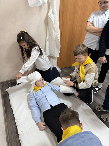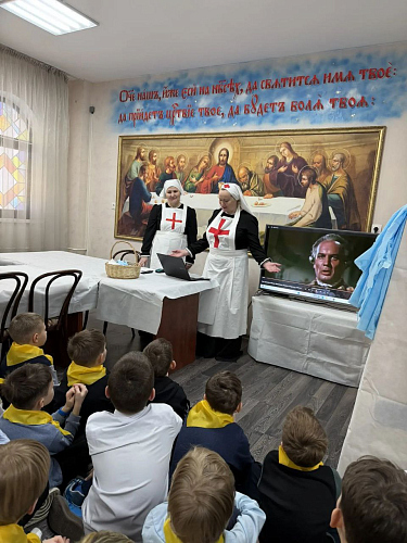 Программа сопровождалась интерактивами в морской и медицинской тематике, а также активностями на ловкость и внимание. В завершающей части ребята поклонились образу праведного Федора Ушакова под пение тропаря угоднику Божию.