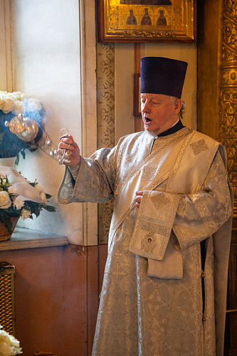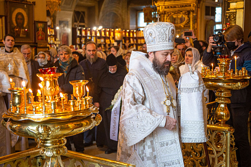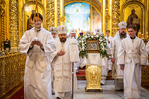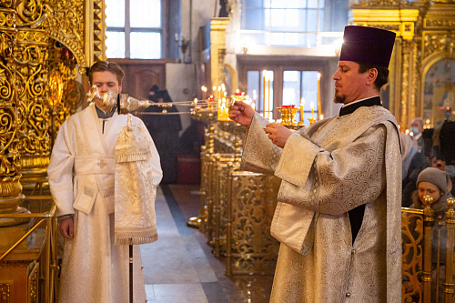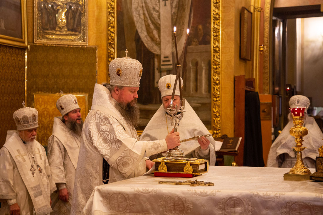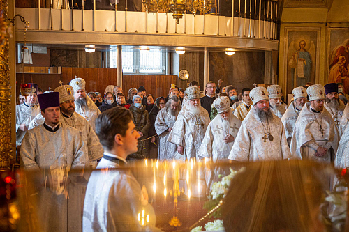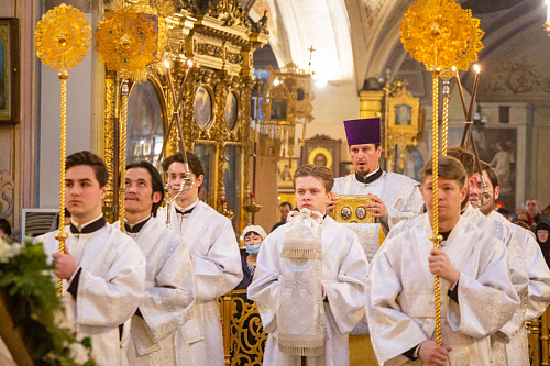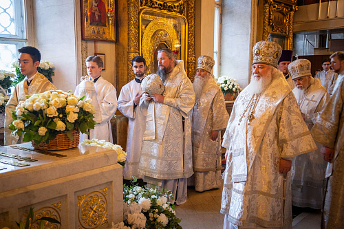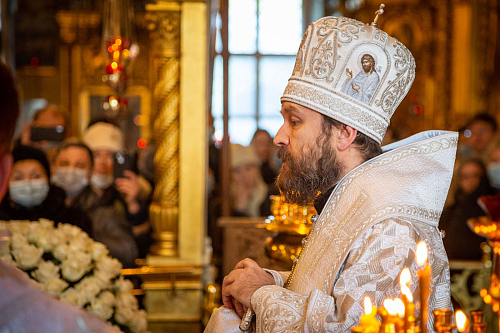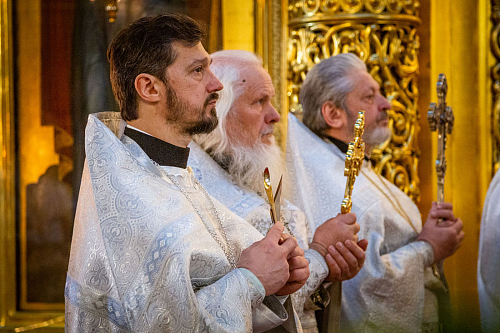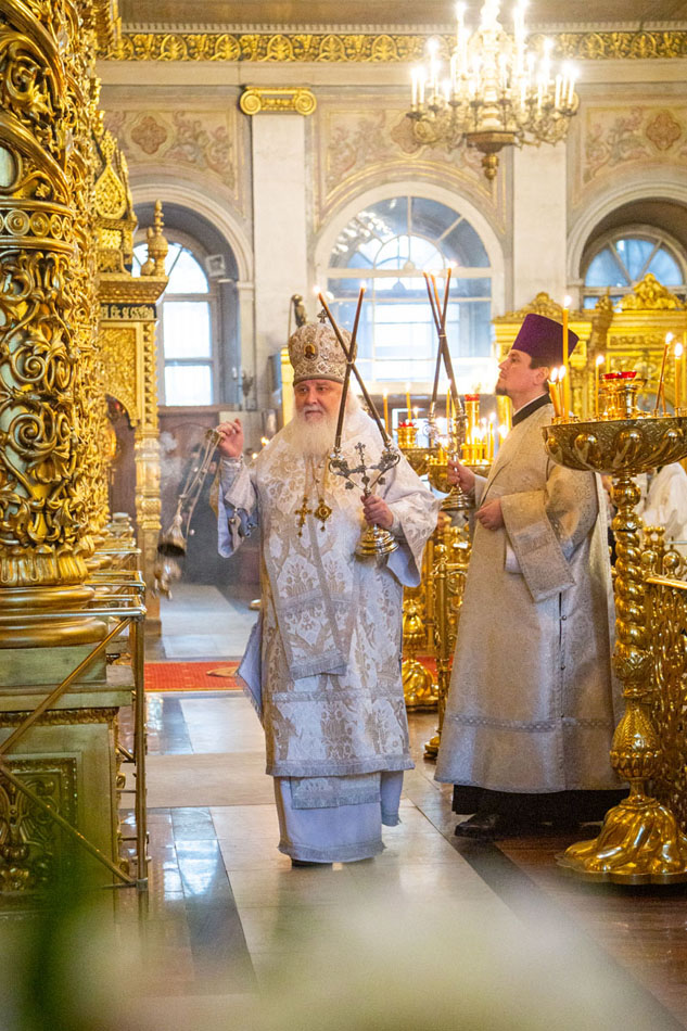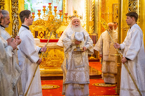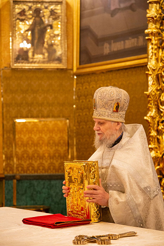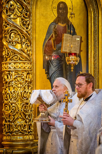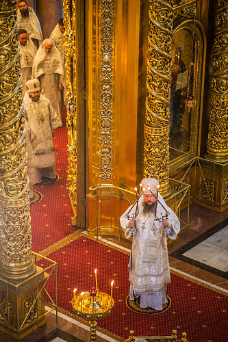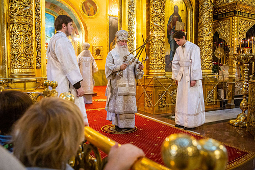 Служение поздней Литургии возглавил управляющий делами Московской Патриархии, первый викарий Святейшего Патриарха по г. Москве, наместник Новоспасского ставропигиального монастыря, управляющий Центральным викариатством митрополит Воскресенский Дионисий, сообщает сайт викариатства.