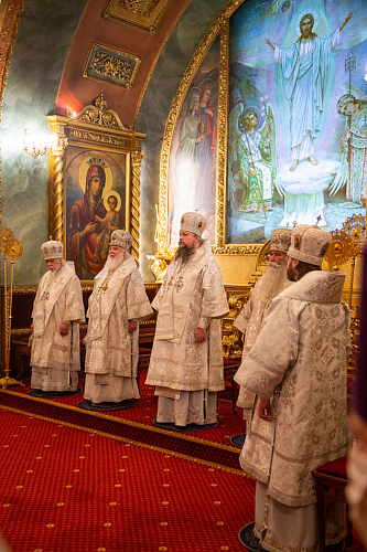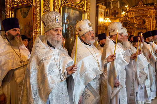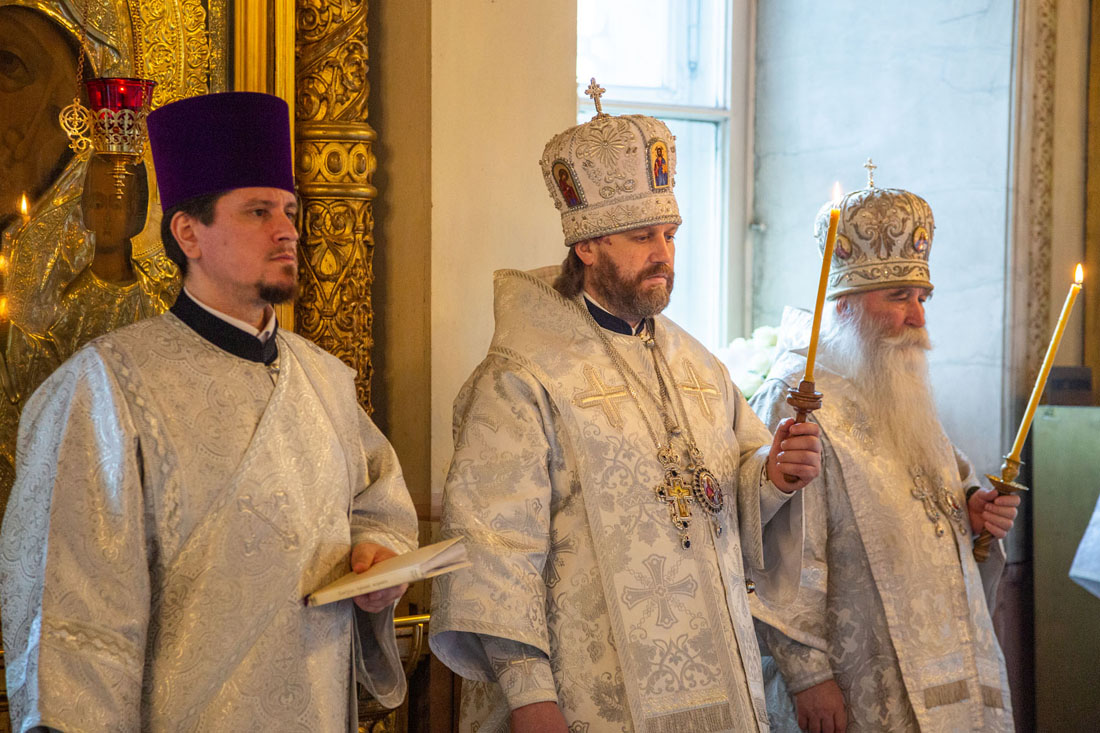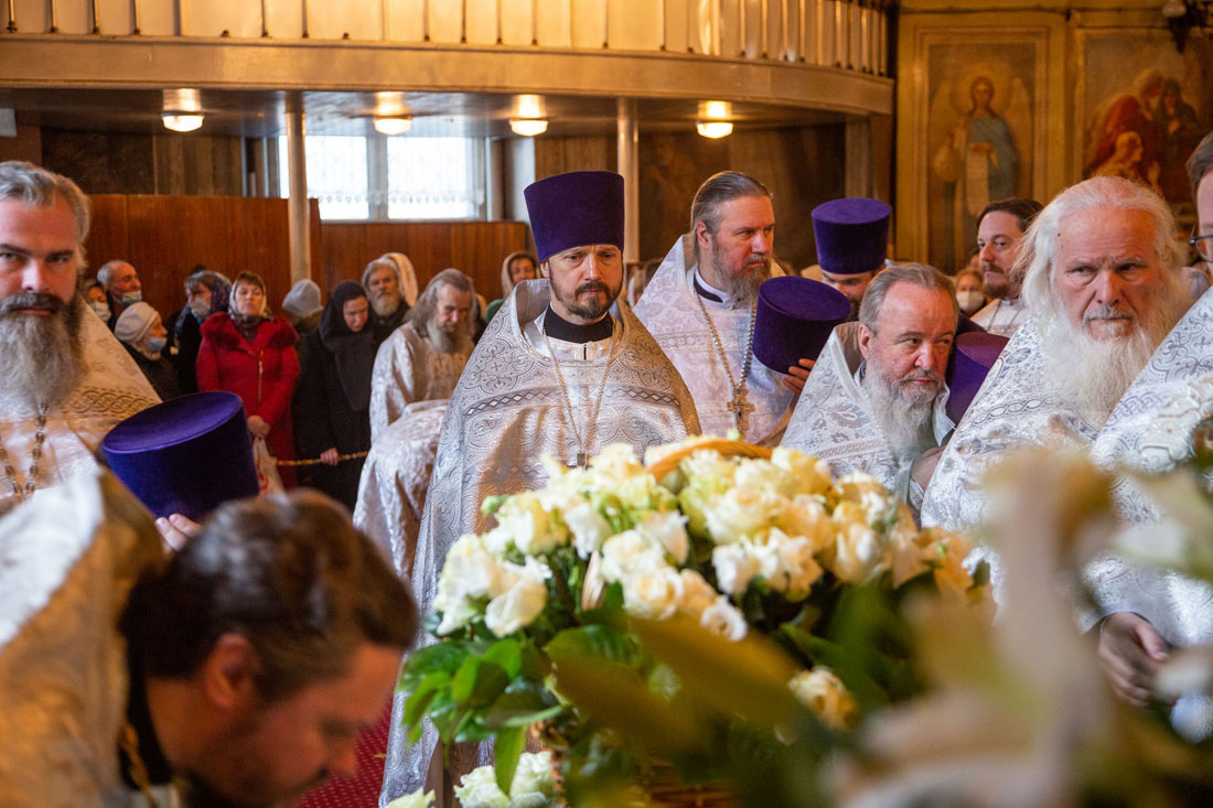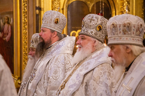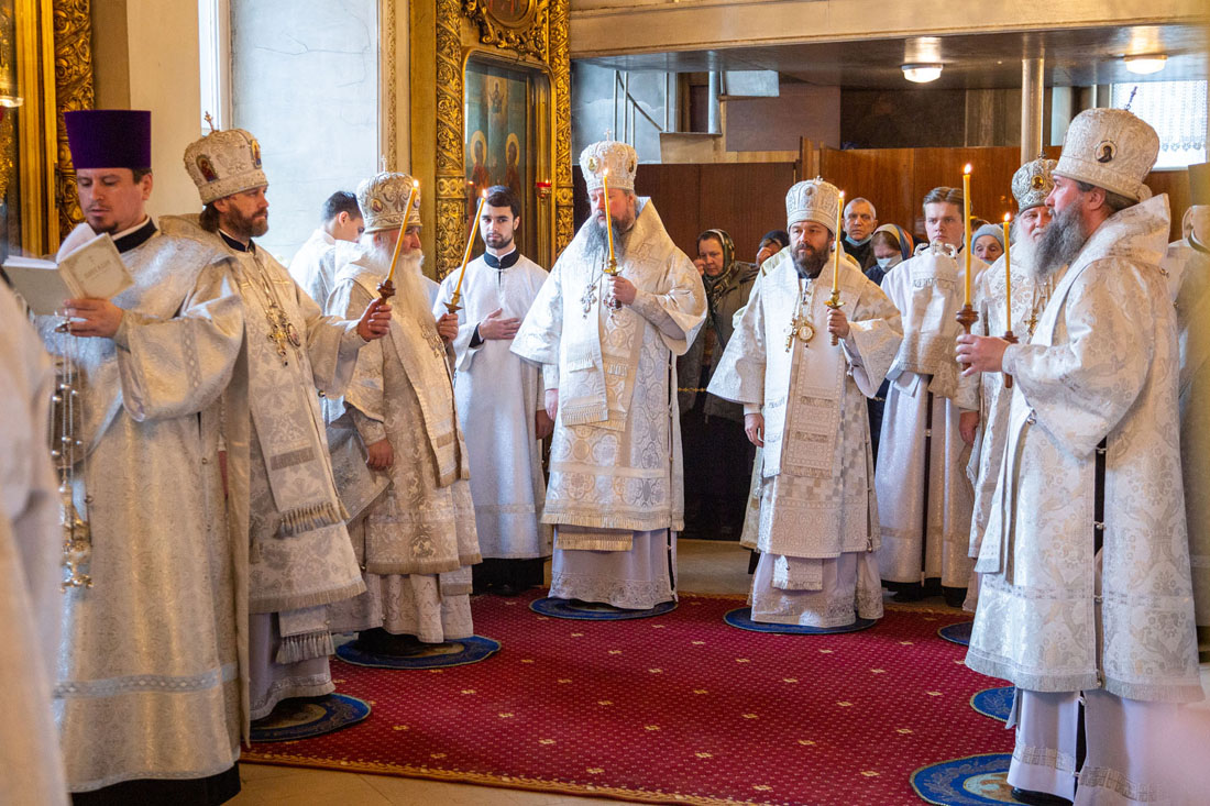 Его Высокопреосвященству сослужили: митрополит Липецкий и Задонский Арсений, наместник Андреевского ставропигиального монастыря, управляющий Юго-Западным викариатством епископ Дмитровский Феофилакт, председатель Синодального отдела по церковной благотворительности и социальному служению, управляющий Восточным викариатством епископ Орехово-Зуевский Пантелеимон, руководитель Административного секретариата Московской Патриархии, управляющий Западным викариатством, настоятель Богоявленского кафедрального собора епископ Павлово-Посадский Фома, председатель Синодального отдела религиозного образования и катехизации, наместник Донского ставропигиального монастыря епископ Бронницкий Евгений, секретарь Патриарха Московского и всея Руси по г. Москве протопресвитер Владимир Диваков, ключарь кафедрального соборного Храма Христа Спасителя протоиерей Михаил Рязанцев, заместитель председателя ОВЦС архимандрит Филарет (Булеков), духовенство московских приходов и клирики других епархий.