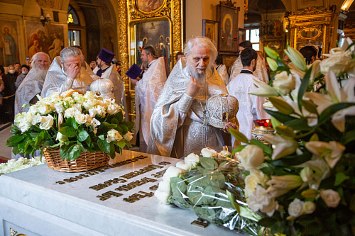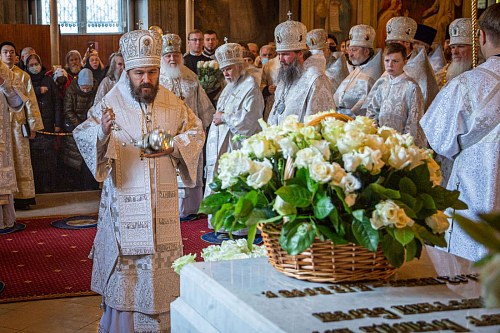 По окончании Литургии председатель Отдела внешних церковных связей Московского Патриархата митрополит Волоколамский Иларион возглавил панихиду у гробницы приснопамятного Святейшего Патриарха в Благовещенском приделе Богоявленского собора.
