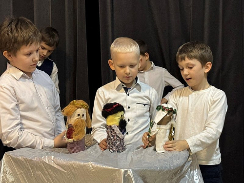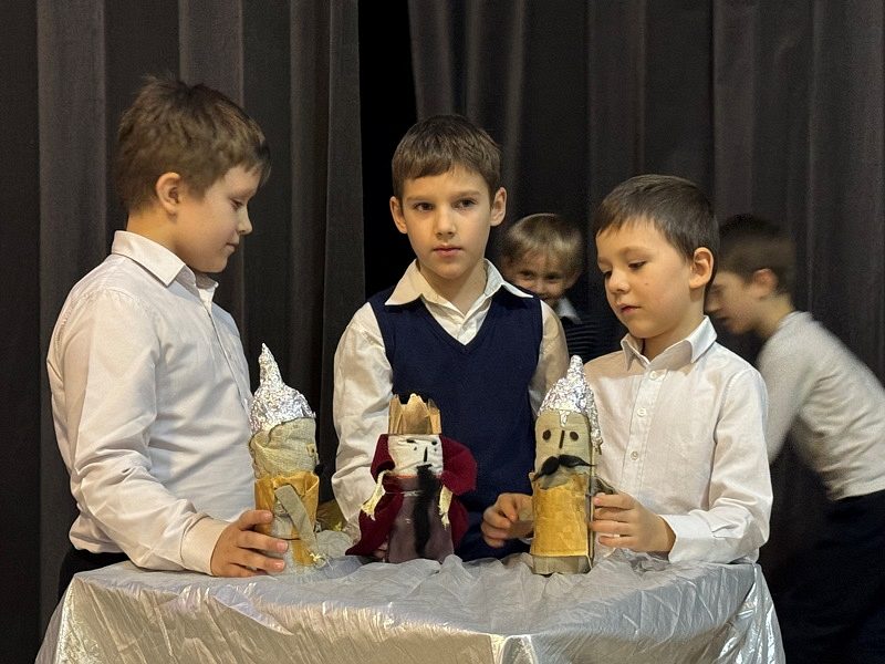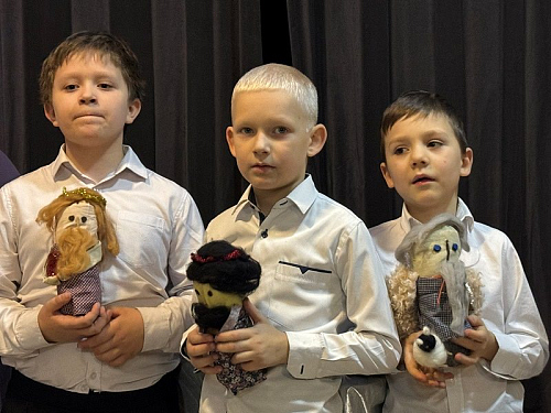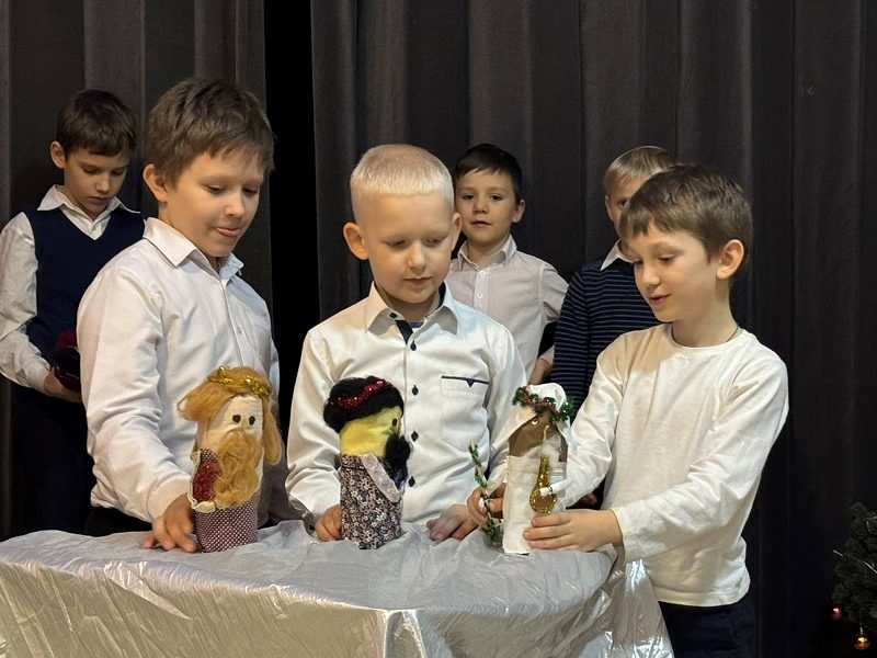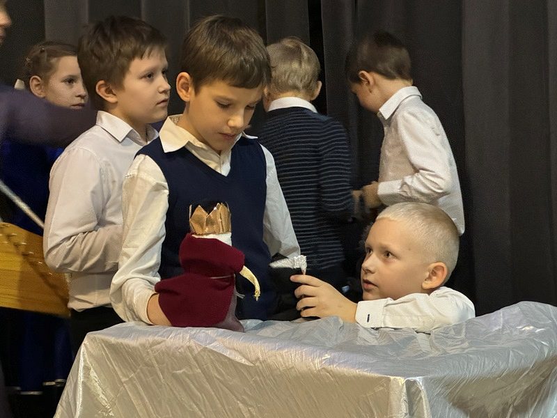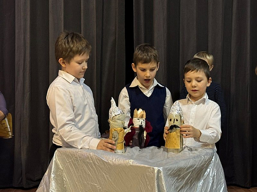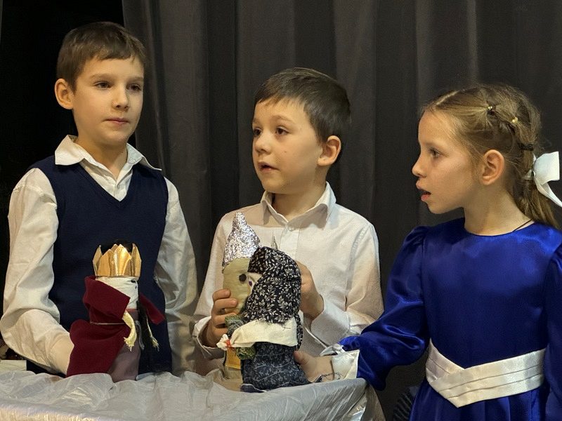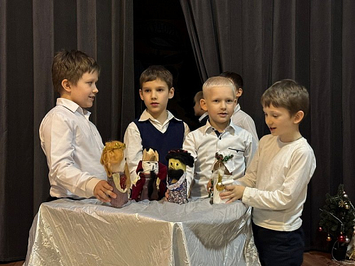 Рождественский спектакль состоял их двух частей. Сначала дети из первых трех классов школы показали небольшой музыкальный кукольный спектакль на тему Рождества Христова в Вифлееме, кукольный вертеп "Смерть царя Ирода". Интересно, что куклы они сделали сами своими руками. Спектакль проходил в стихотворной форме с добавлением различных рождественских песнопений. Маленькие актеры от души исполняли свои роли и сами переживали Евангельские события.