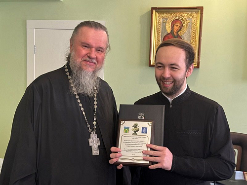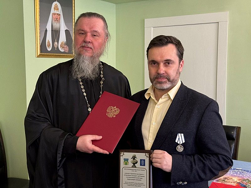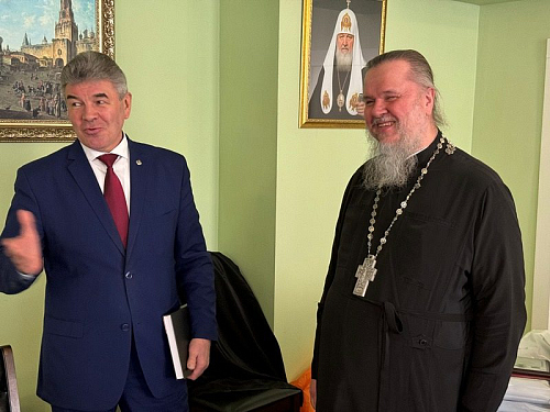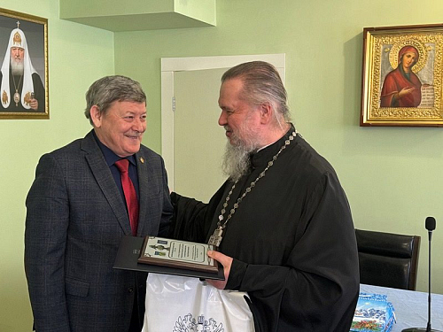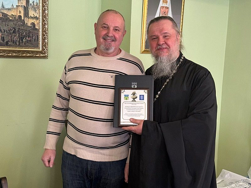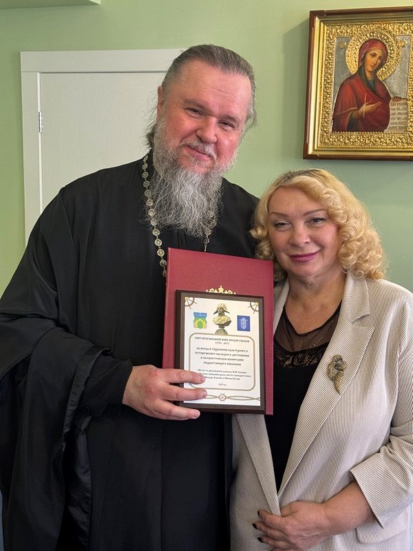 Глава Муниципального округа Южное Бутово Голубцов Павел Викторович поблагодарил настоятеля и госьтей за их труды и пердал в музей Патриаршего подворья несколько ценных исторических экспонатов с линии фронта СВО.
