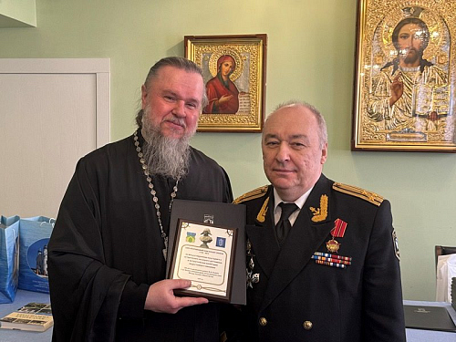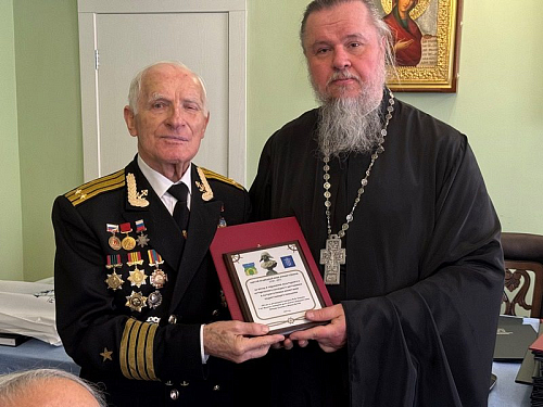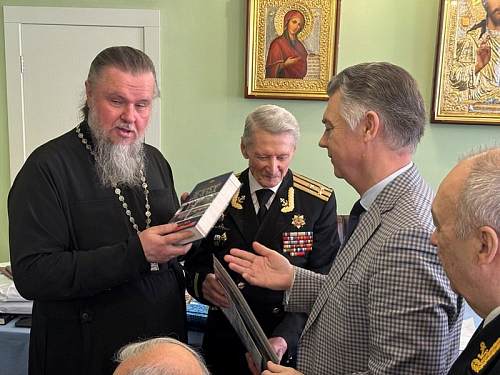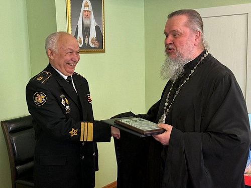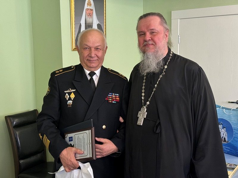 Поздравил настоятеля и прихожан друг храма Святого адмирала председатель Объединённого Совета ветеранов ВМФ Московского Комитета ветеранов войны капитан 1 ранга Валерий Иванович Васильев, который передал Патриаршего подворью интересную литературу про Военно-Морской флот России.