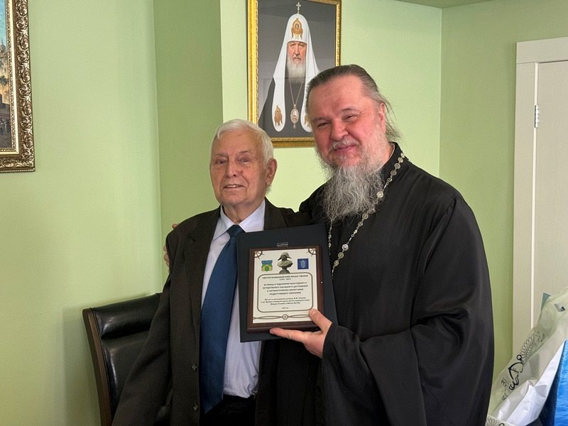 Заместитель директора школы 1161 и Председатель Краеведческого общества Антон Семенович Никулин передал настоятелю замечательные книги по истории Российского флота и краеведению Москвы.