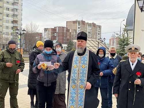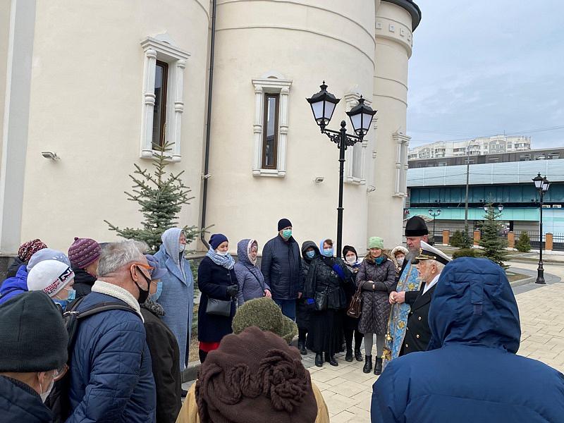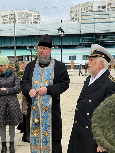 После праздничного богослужения настоятель храма игумен Дамиан (Залетов), прихожане и гости, собрались около памятников Российскому флоту у алтаря храма - исторических якорей российских кораблей, адмиралтейских якорей.