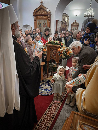 Затем Владыка Владимир обратился к пастве с Архипастырским словом.Он поздравил всех свеликим праздником в честь святителя и чудотворца Николая, призвал к молитвам Святому Угоднику Божию и преподал благословение.Его Высокопреосвященство также поздравил клирика храма иерея Николая Кошняну с днем Небесного покровителя, вручив Богослужебную просфору. От имени прихода помощник настоятеля иеромонах Ефрем (Русу) сердечно поздравил Владыку Митрополита с праздником и поблагодарил за совместное служение.