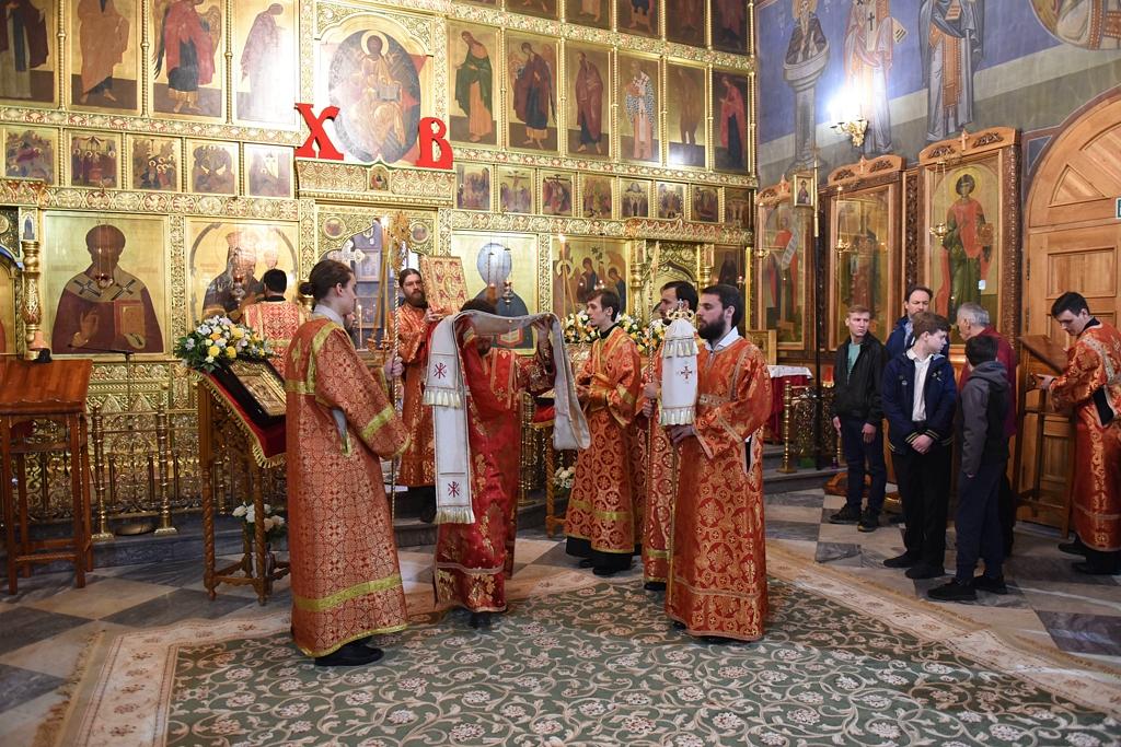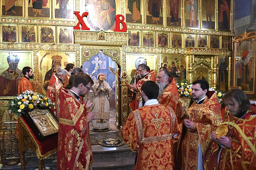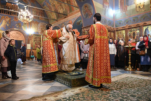 По окончании Литургии было совершено славление. Епископ Пантелеимон прочитал молитву святителю Николаю, архиепископу Мир Ликийских. Затем Владыка и духовенство поклонились иконе святителя Николая.
