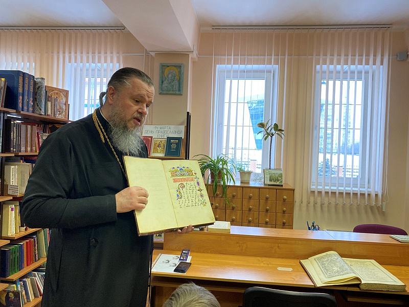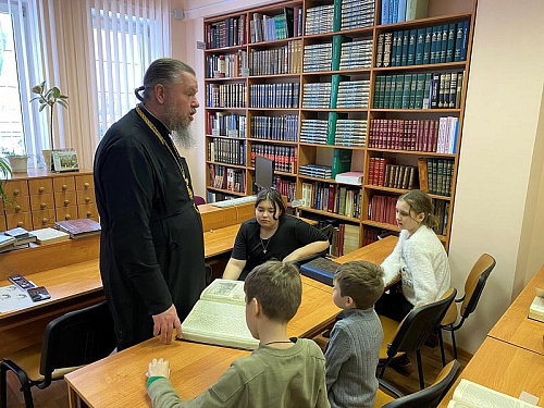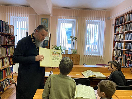 Настоятель Подворья игумен Дамиан (Залетов) провел с учащимися беседу, рассказав детям историю создания первых книг, о первопечатнике – дьяконе Иване Федорове, трудами которого была создана первая книга «Апостол», а также о значении книги в жизни каждого человека. В этом году исполнилось 456 лет со дня издания первопечатной книги.