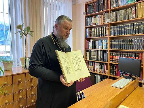 Детям было показано несколько старинных книг, в том числе книга древнерусских нот, крюкового пения, которые представил детям настоятель храма игумен Дамиан.