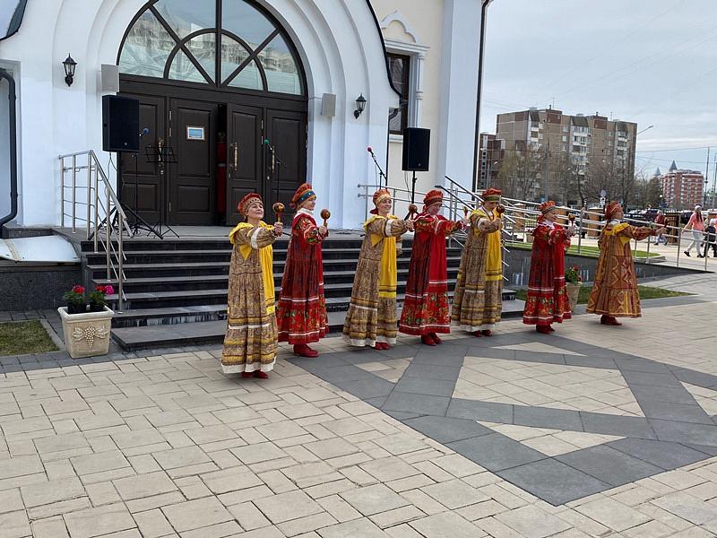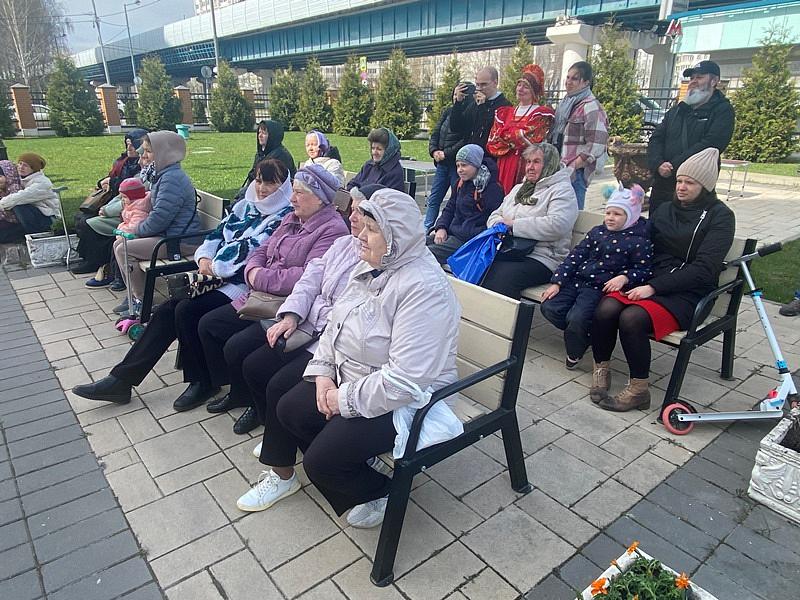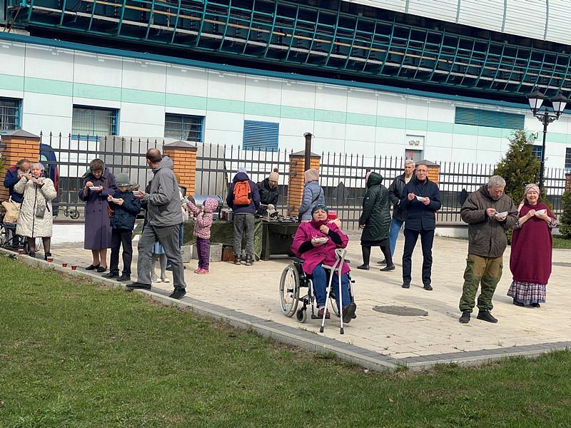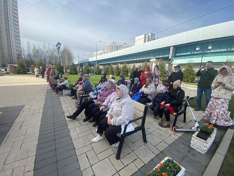 После праздничного богослужения прихожане и все желающие были приглашены на Пасхальный праздник, который состоялся на улице около храма святого праведного воина Феодора Ушакова в Южном Бутове.