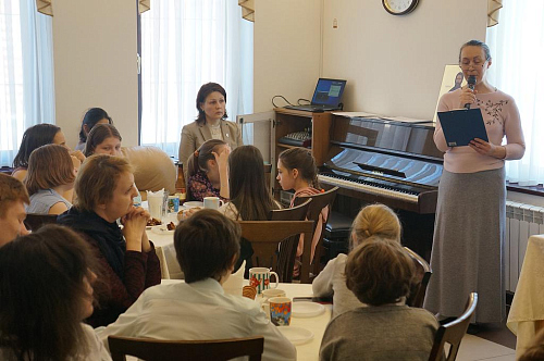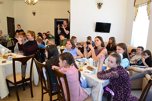 Настоятель храма, иерей Алексей Петухов, открыл встречу с молитвы и приветствия собравшихся в Доме причта детей, родителей, педагогов, благословив чаепитие и концерт.
