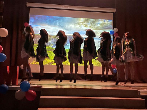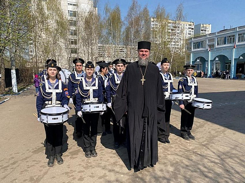 Далее все учащиеся и гости прошли в актовый зал школы, где праздничное мероприятие продолжилось, прозвучали поздравления от гостей и состоялась обширная концертная программа. Игумен Дамиан поприветствовал знаменную группу и группу барабанщиков из школы 1883, с которыми у храма многолетняя дружба и взаимодействие.