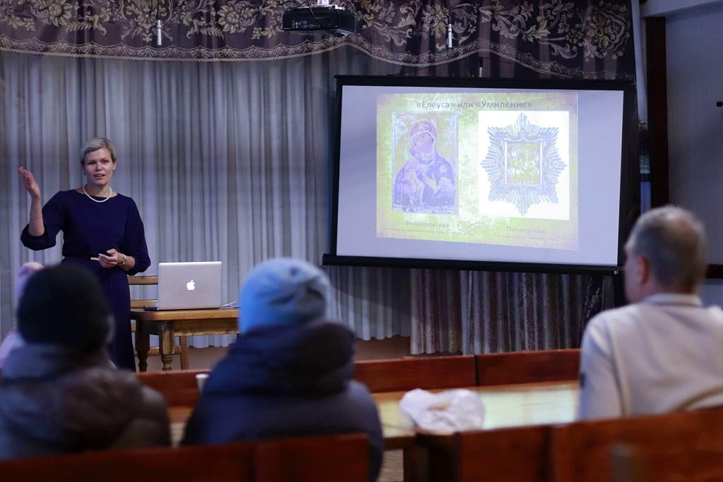 В ходе встречи лектор осветила широкий круг вопросов, связанных с иконографией Пресвятой Богородицы: историю утверждения почитания Пресвятой Богородицы на Третьем Вселенском Соборе 431 года, появления ранних Богородичных изображений, развитие и установление основных иконографических типов Богородицы: Оранта, Одигитрия и Елеуса, а также их взаимосвязь с главными христианскими добродетелями - Верой, Надеждой и Любовью.
