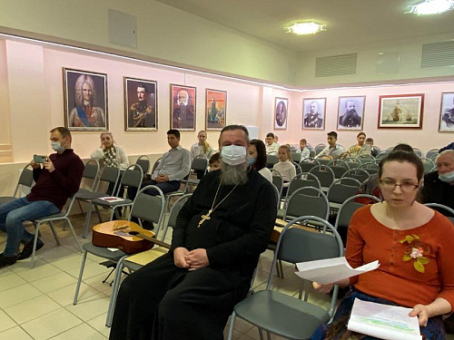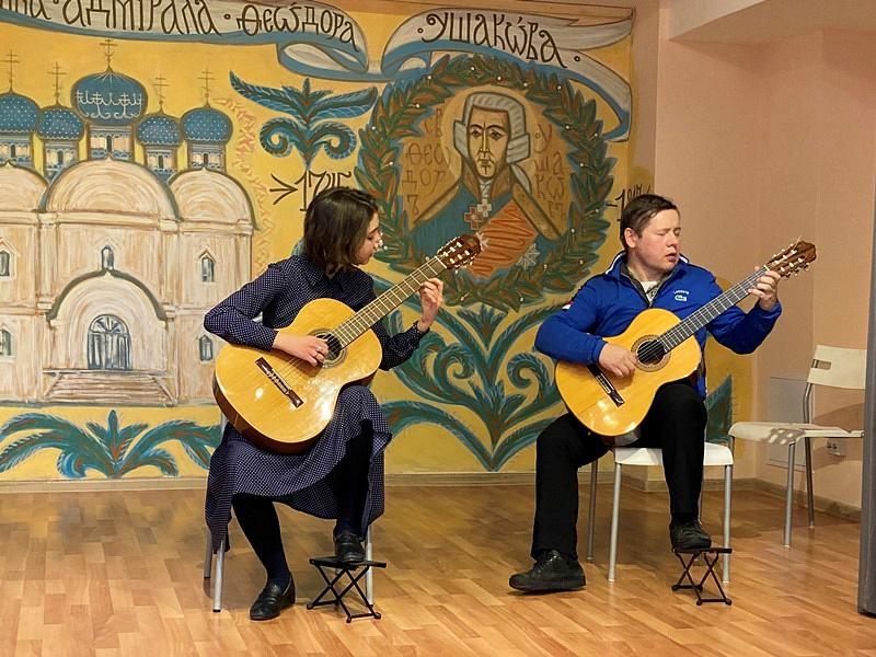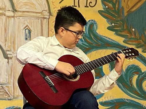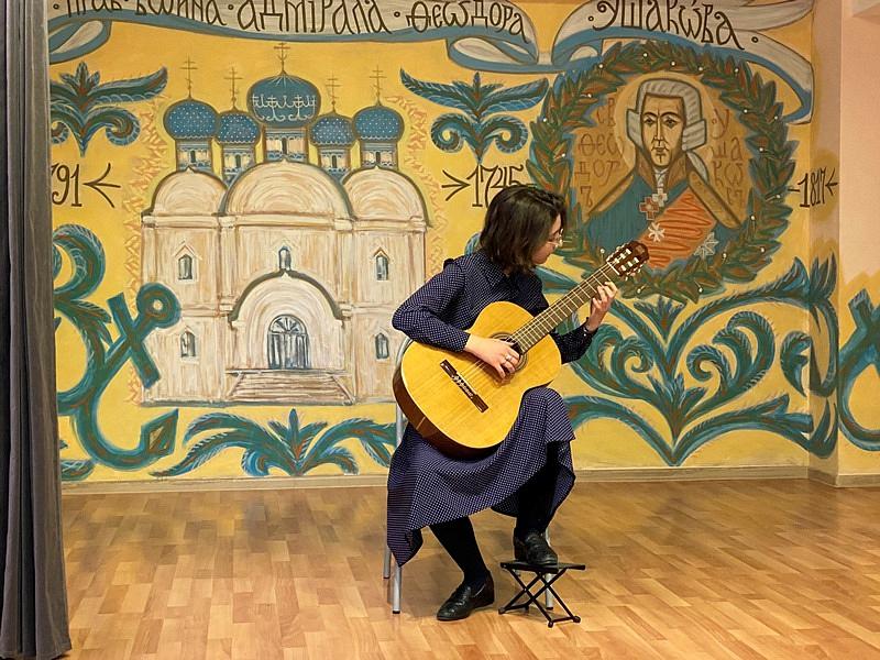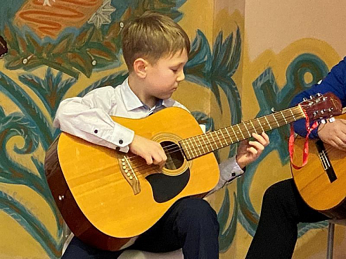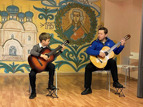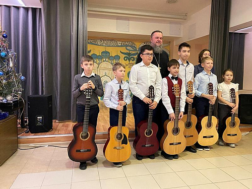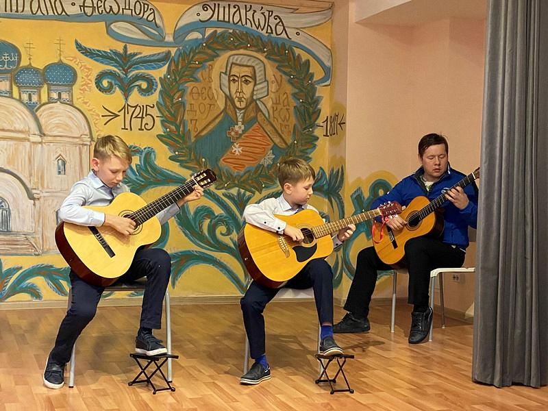По приглашению настоятеля храма игумена Дамиана (Залетова), ансамбль гитар Детской школы искусств им. В.В. Крайнева и кружка Воскресной школы Патриаршего подворья дал концерт в актовом зале дома причта для гостей, родителей и учащихся.