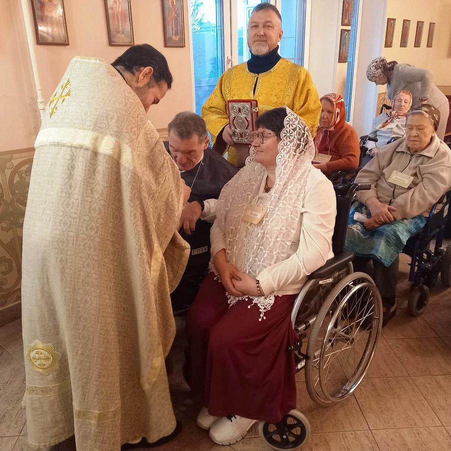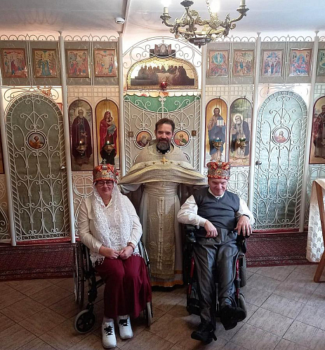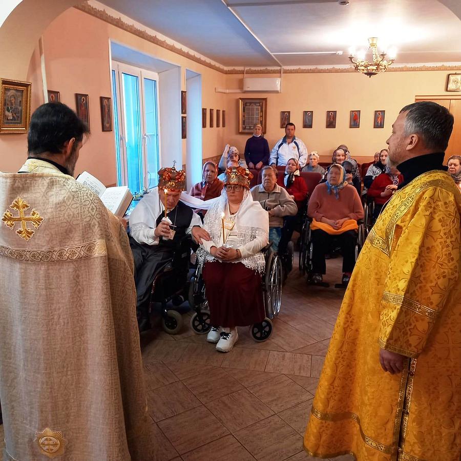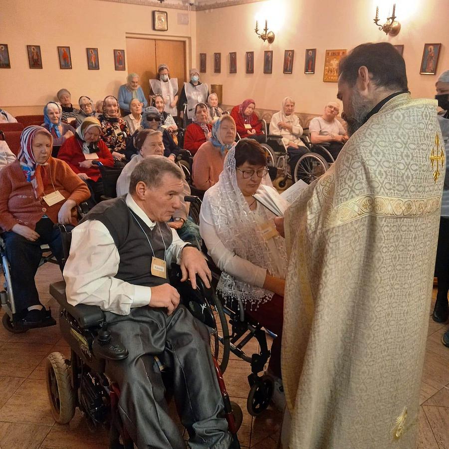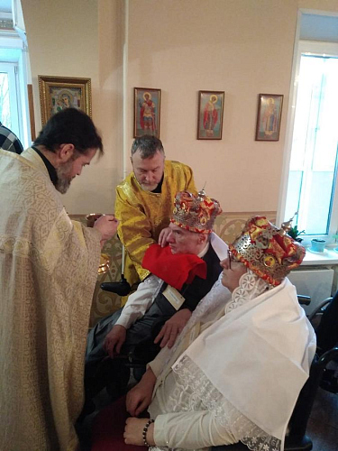 Большой радостью для всех присутствующих было Таинство Венчания для семейной пары, проживающей в пансионате. Настоятель напутствовал брачующихся добрыми пожеланиями и вручил памятные подарки.